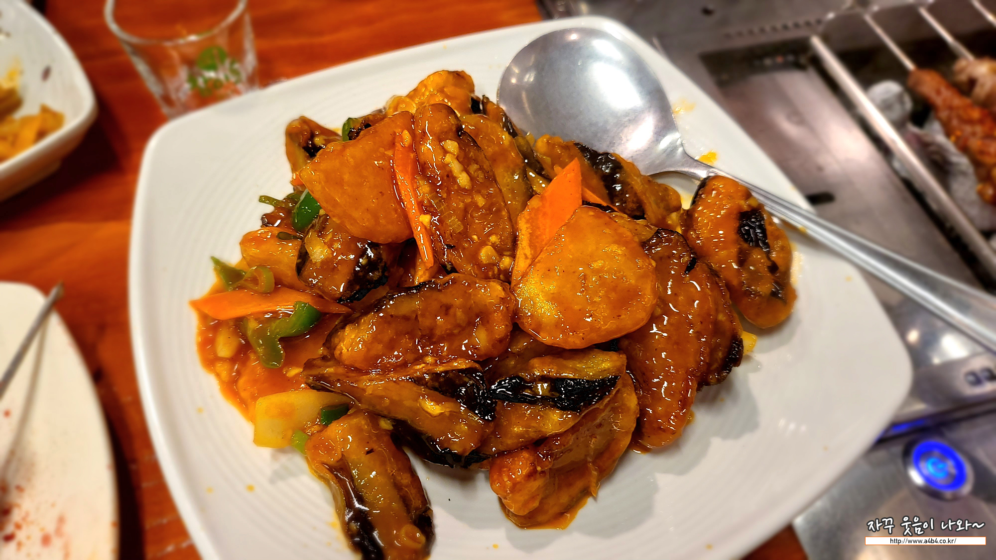 나름 회식인데, 양꼬치만 먹다보니 물리네요. 몇가지 요리 주문했고 먼저 나온 메뉴가 어향가지입니다. 간단하게 설명하면 일종의 가지튀김 인데요. 식감좋고 맛있게 잘 먹었습니다. 다만 너무 달달하다고 할까요