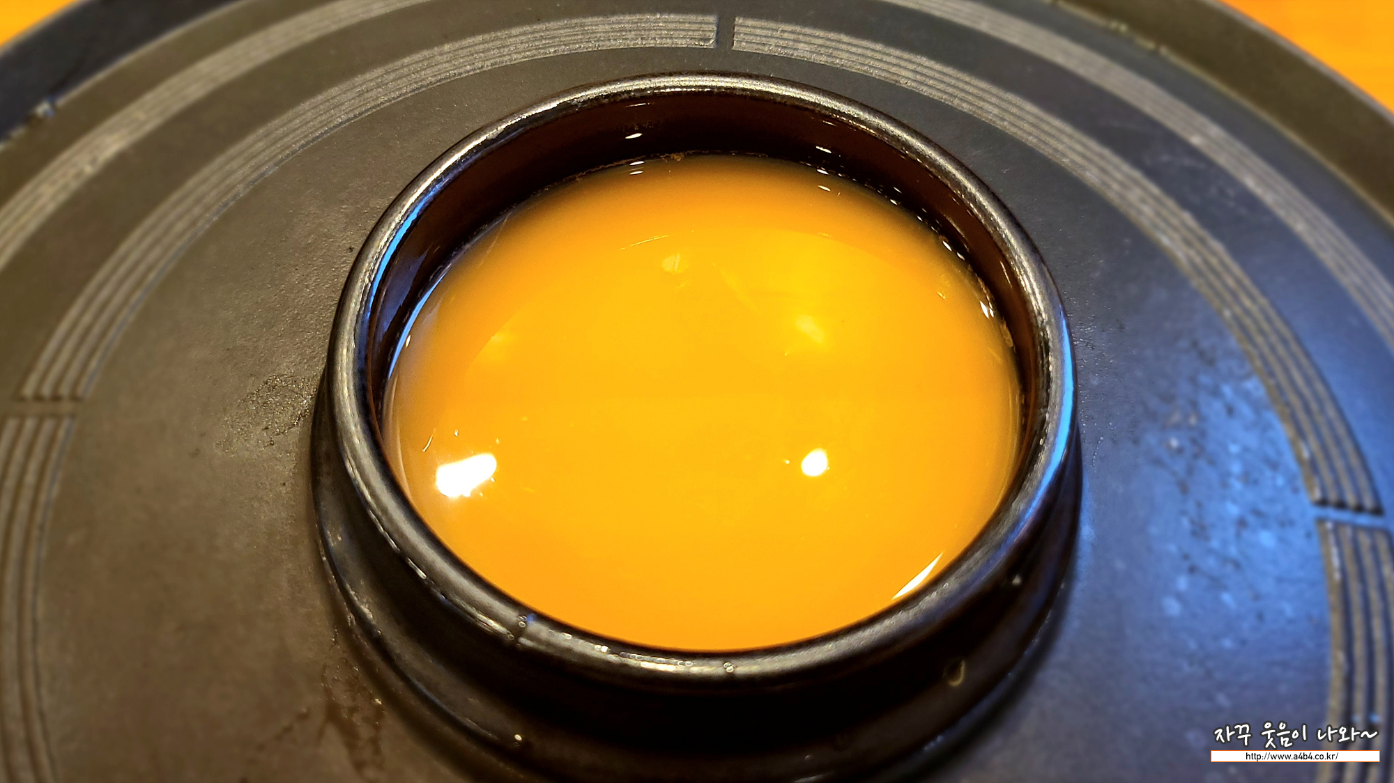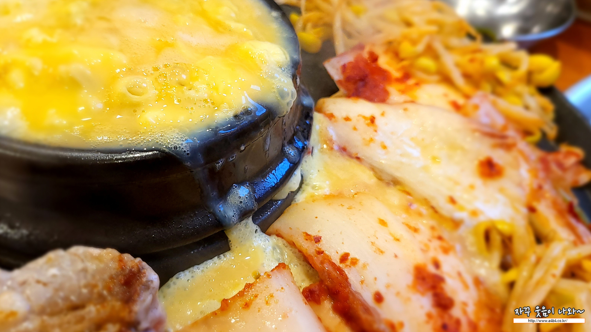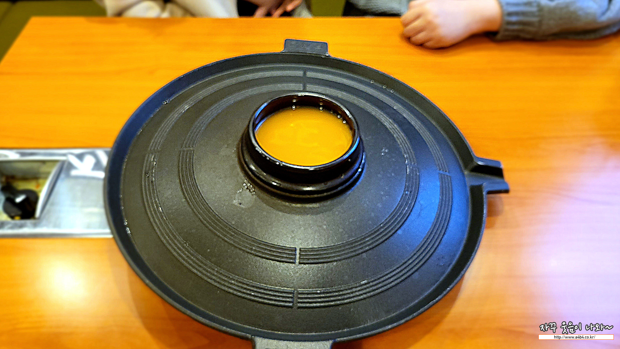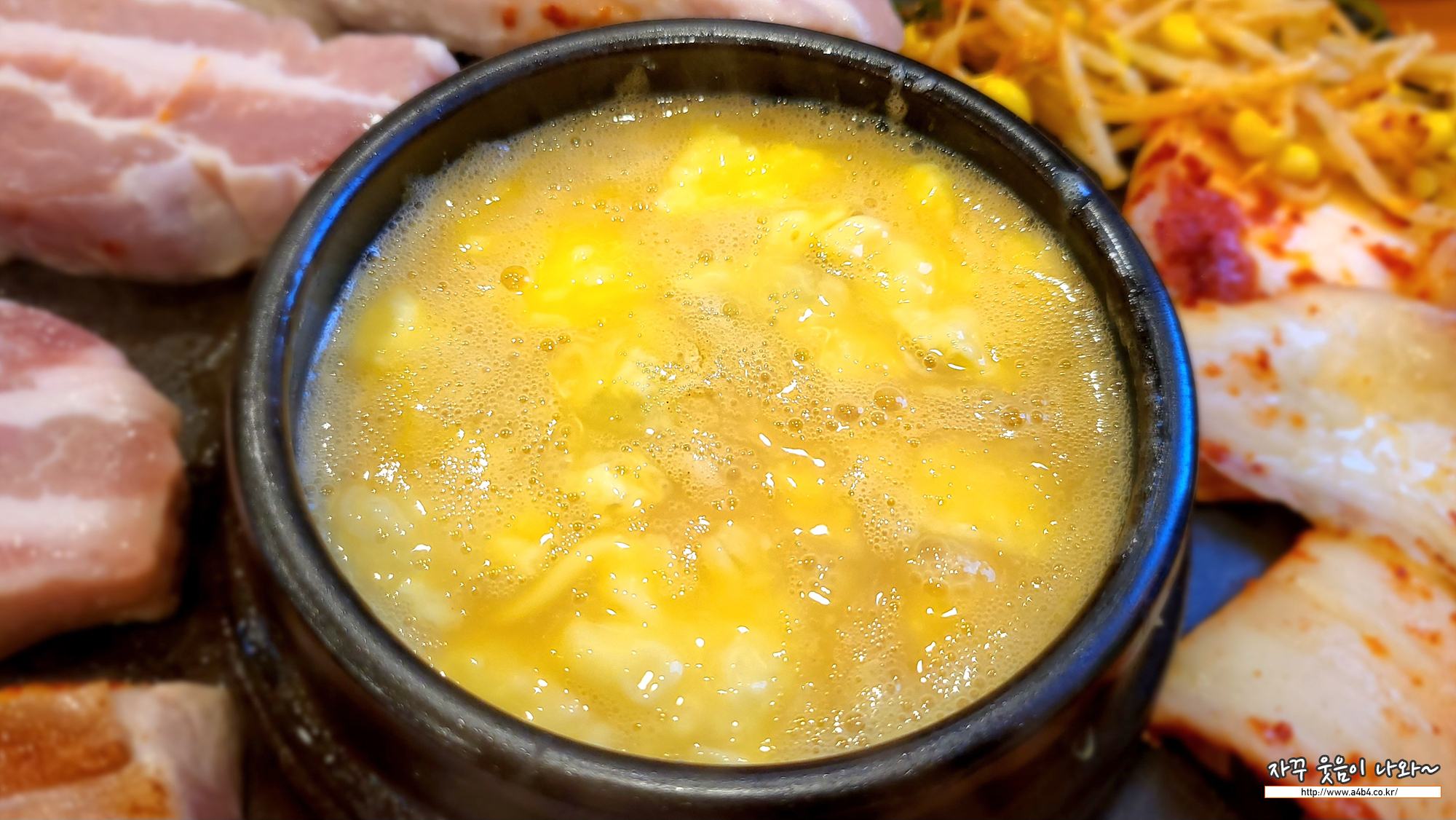 그 사이에 처음에 올라갔던 노란 물이 계란찜으로 변해가고 있습니다. 중간중간 직원분께서 오셔서 계란물을 뒤집어 주시는데요. 삼겹살이 잘 구워지기 전에 계란찜은 완성되어 먼저 먹었네요.