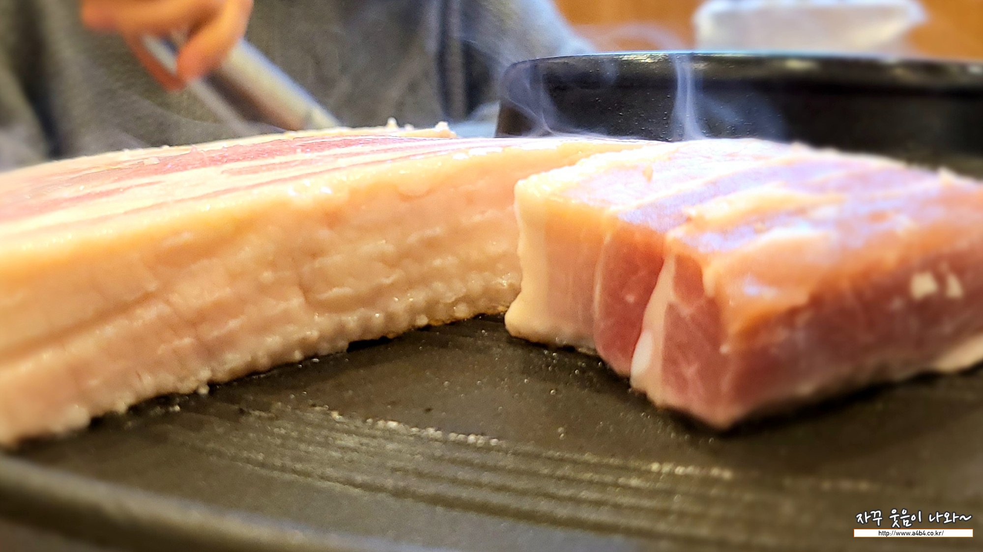 불판위에 두꺼운 삼겹살이 올라가니 구워지는데 시간이 필요합니다.
