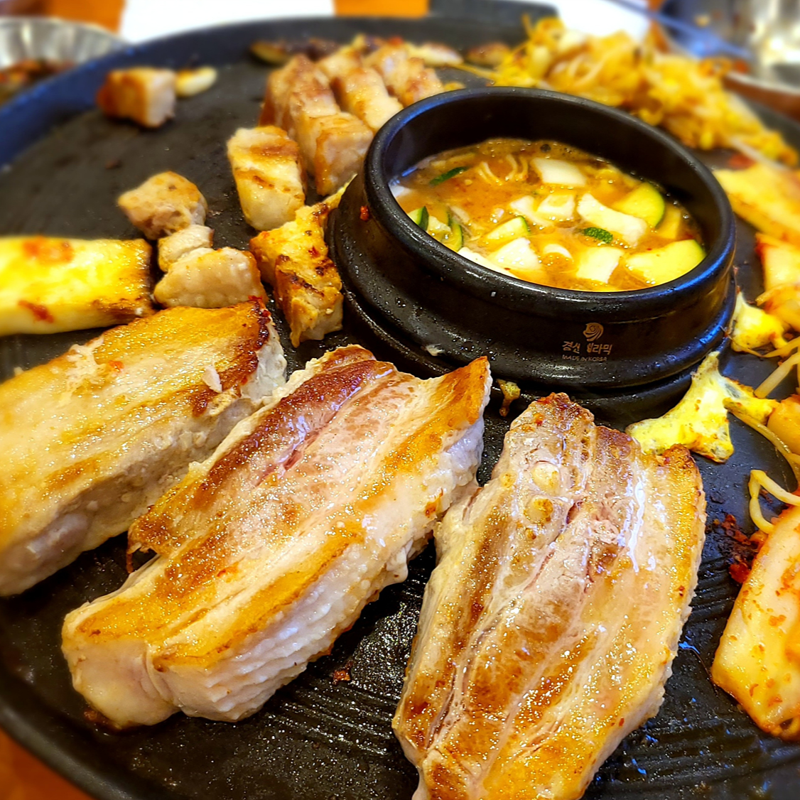 솥뚜껑 모양의 삽겹살 불판과 불판 가운데에 노란색 물이 들어있는 뚝배기가 올라가 있네요.
