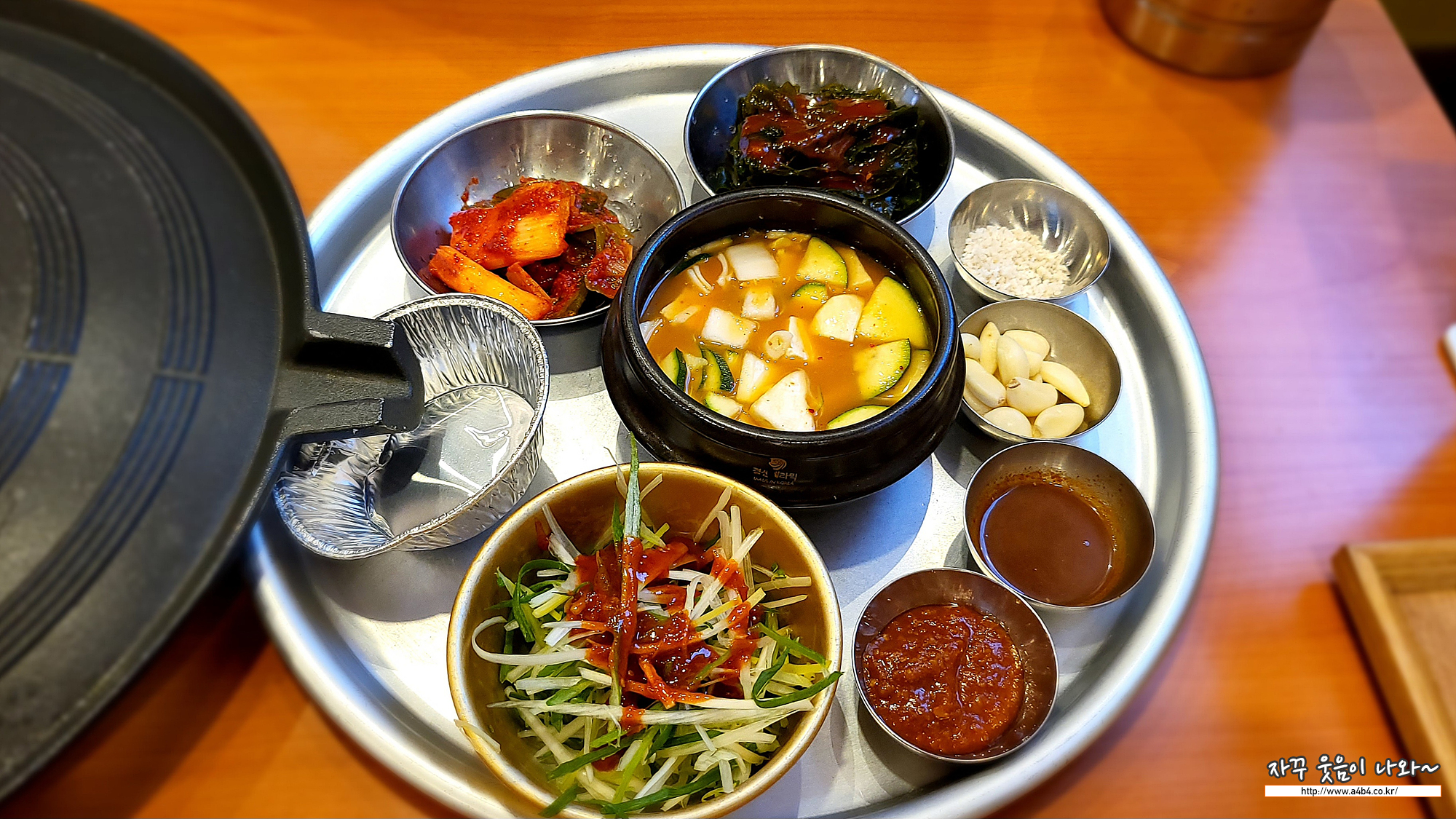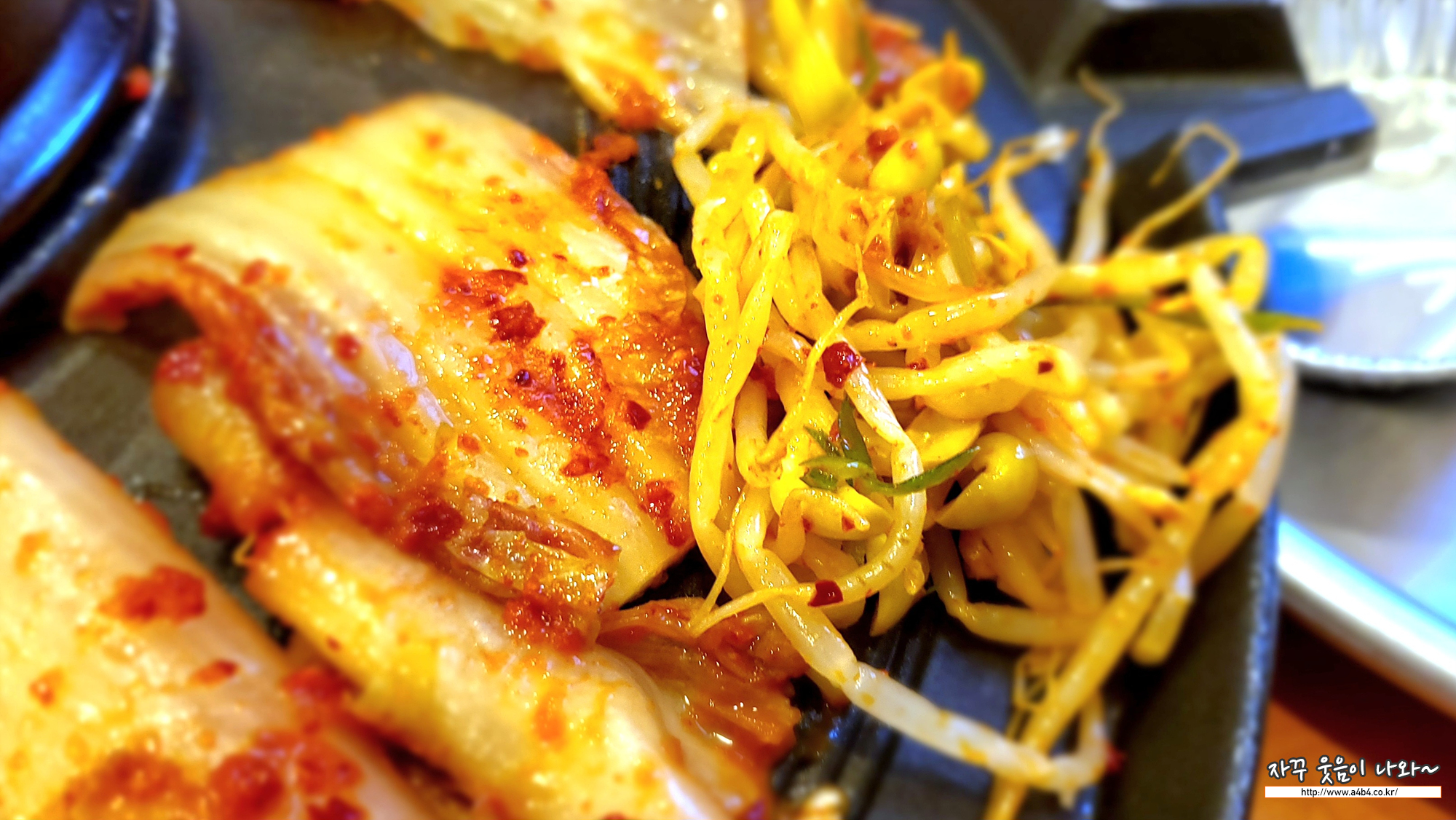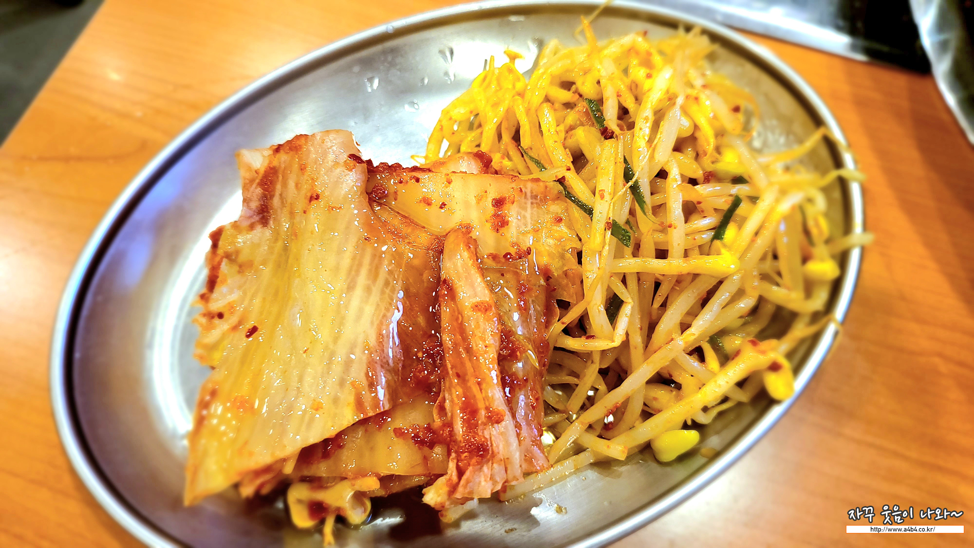 그리고 불판위에 올려먹는 묵은지와 콩나물무침도 처음에 같이 나오네요.