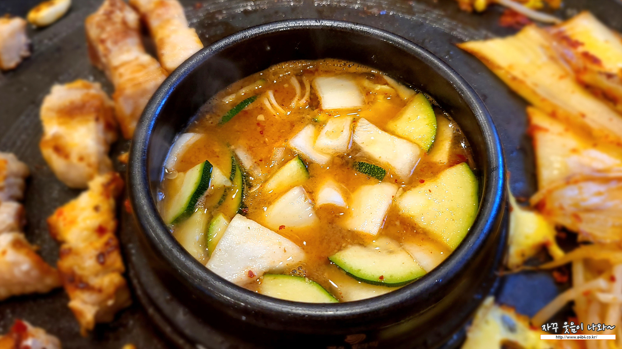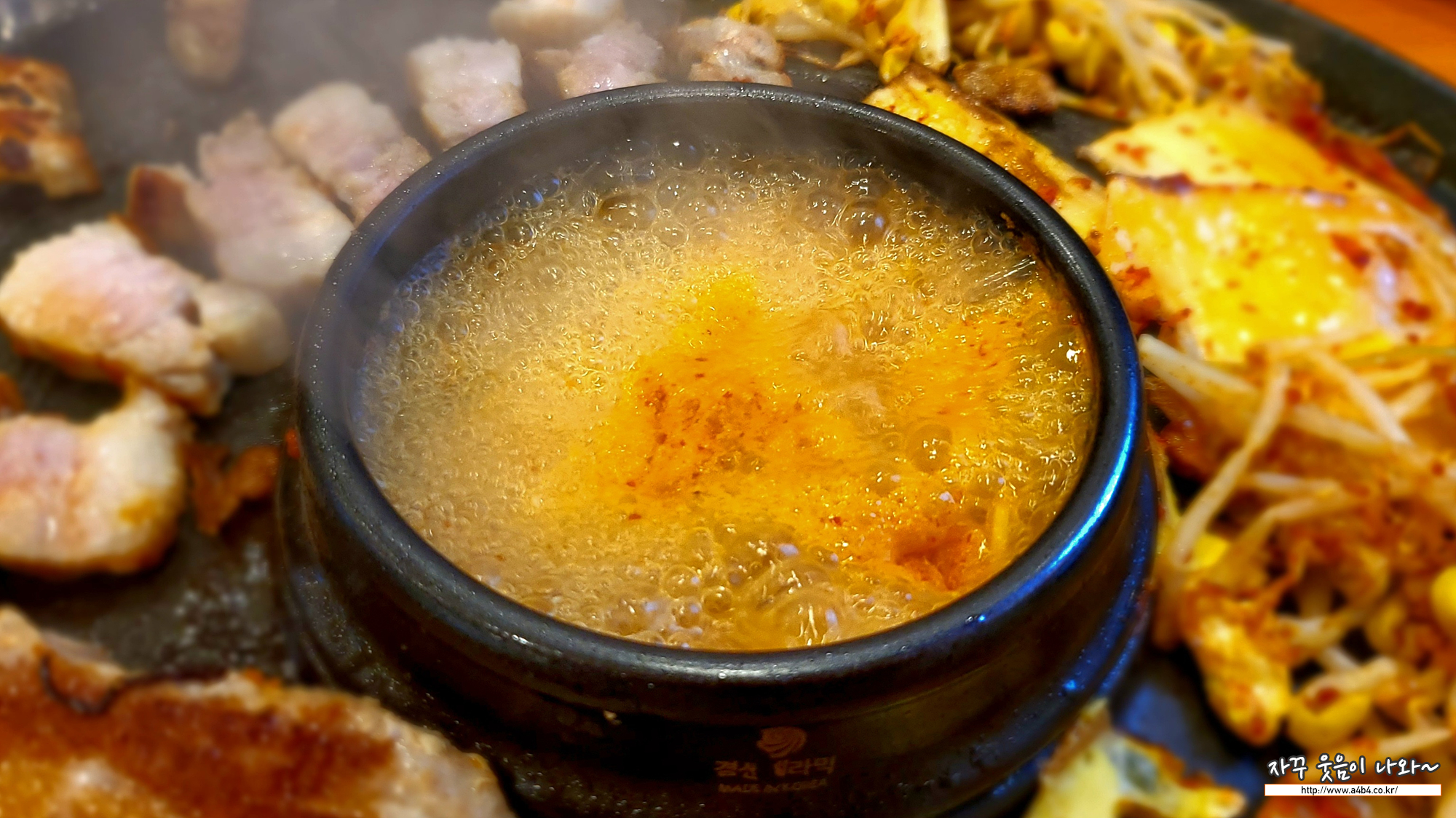 아까 솥뚜겅 불판 중앙에 있던 계란찜은 내려놓고, 그 위에 된장찌개를 올려 놓습니다. 역시 삼겹살과 함께 뜨끈한 국물을 먹으니 더욱더 입에 쑥쑥 들어가네요.