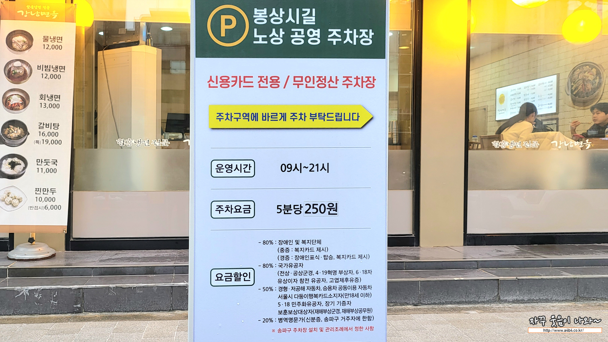 아쉽게도 잠실새내에 위치한 많은 맛집들이 주차장이 없거나 아주 적은 대수의 주차장만 운영하고 있습니다. 이곳 효자동 솥뚜껑 삼겹살은 주차장이 없으며, 건물앞 '봉상시길 노상 공영 주차장'을 유료로 이용하셔야 합니다.