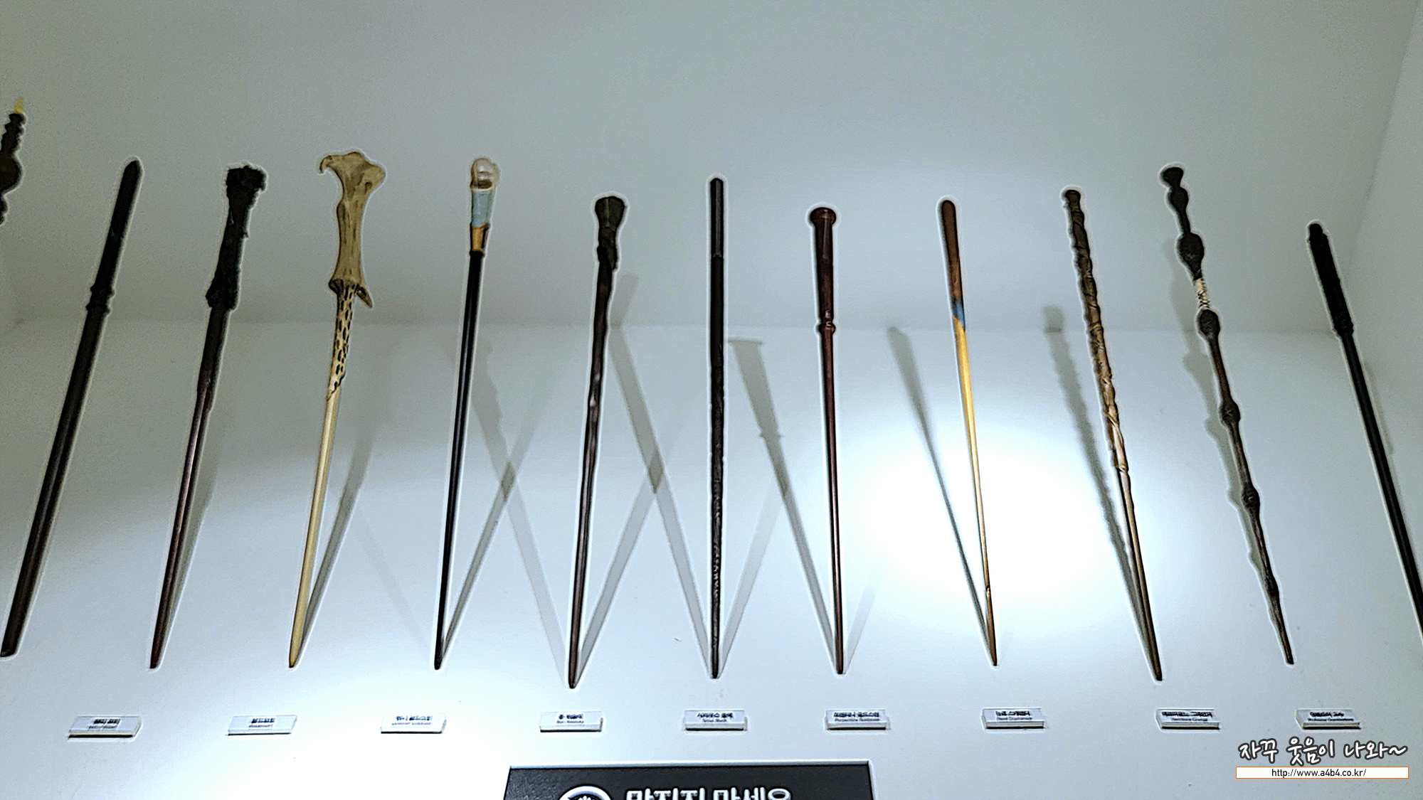먼저 해리포터의 주인공들이 사용하는 다양한 마법 지팡이가 전시되어 있습니다. 지팡이와 지팡이의 주인공들이 표시되어 있는데요. 쪼그리고 앉아서 보려니 힘드네요. 오른쪽은 수어사이드 스퀴드 여주인 할리퀸이 사용하던 야구 방망이 입니다.