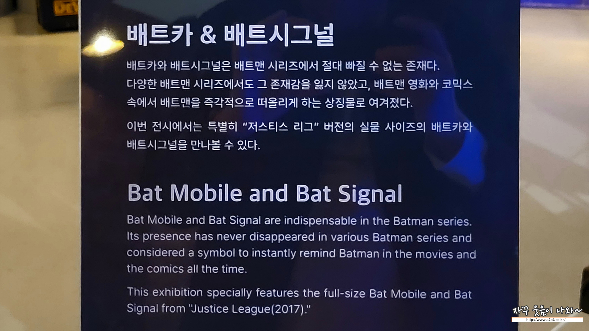 이번 워너 브라더스 100주년 셀러브레이션 특별전에는 영화 저스티스 리그 버전의 실물 배트카다 전시되었다고 합니다.