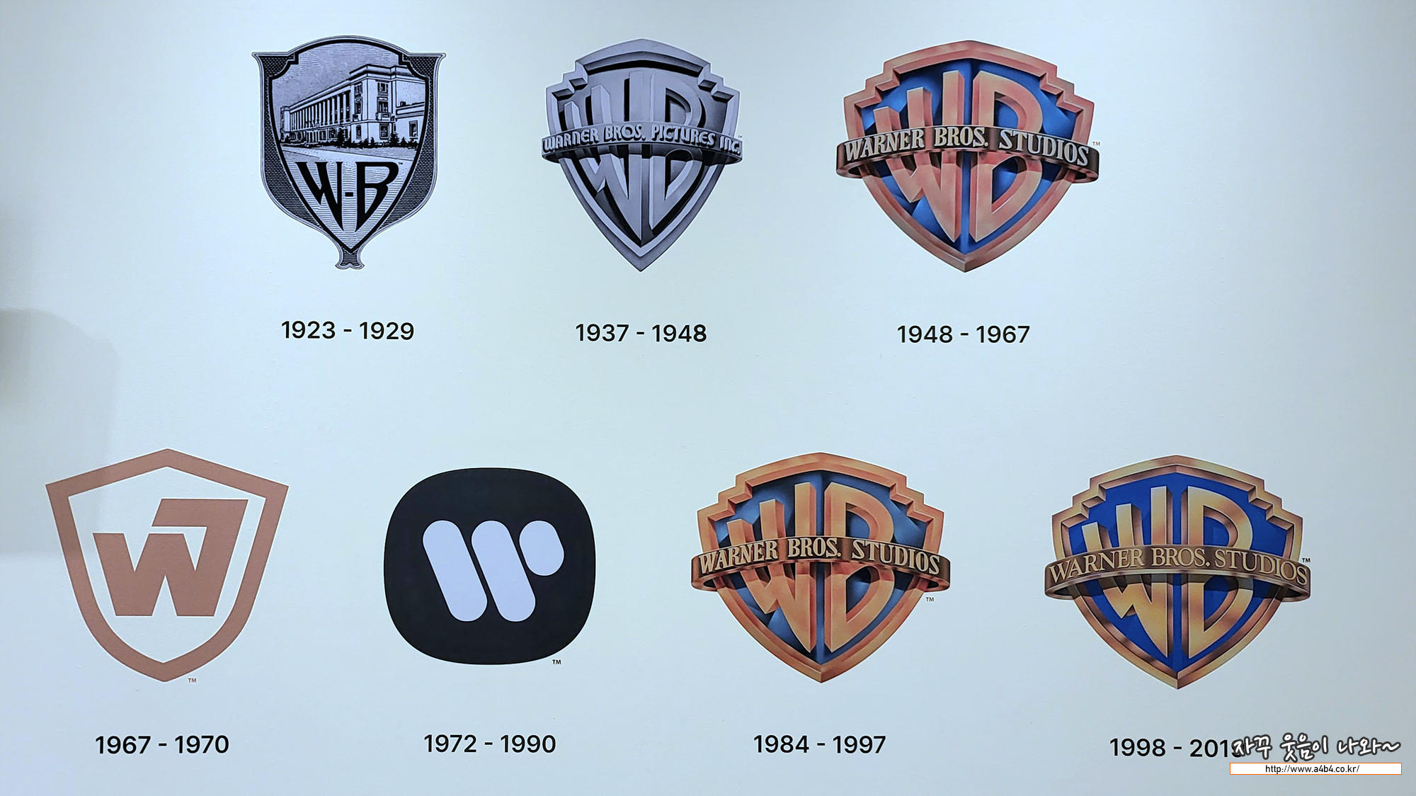 워너 브라더스 100주년 특별전 첫 시작은 워너브라더스 역사가 소개됩니다. 그 유명한 워너의 로고심볼의 변천사를 만나볼 수 있는데요. 역시 WB 조합의 방패 무늬의 로고심벌이 가장 정감이 가네요.