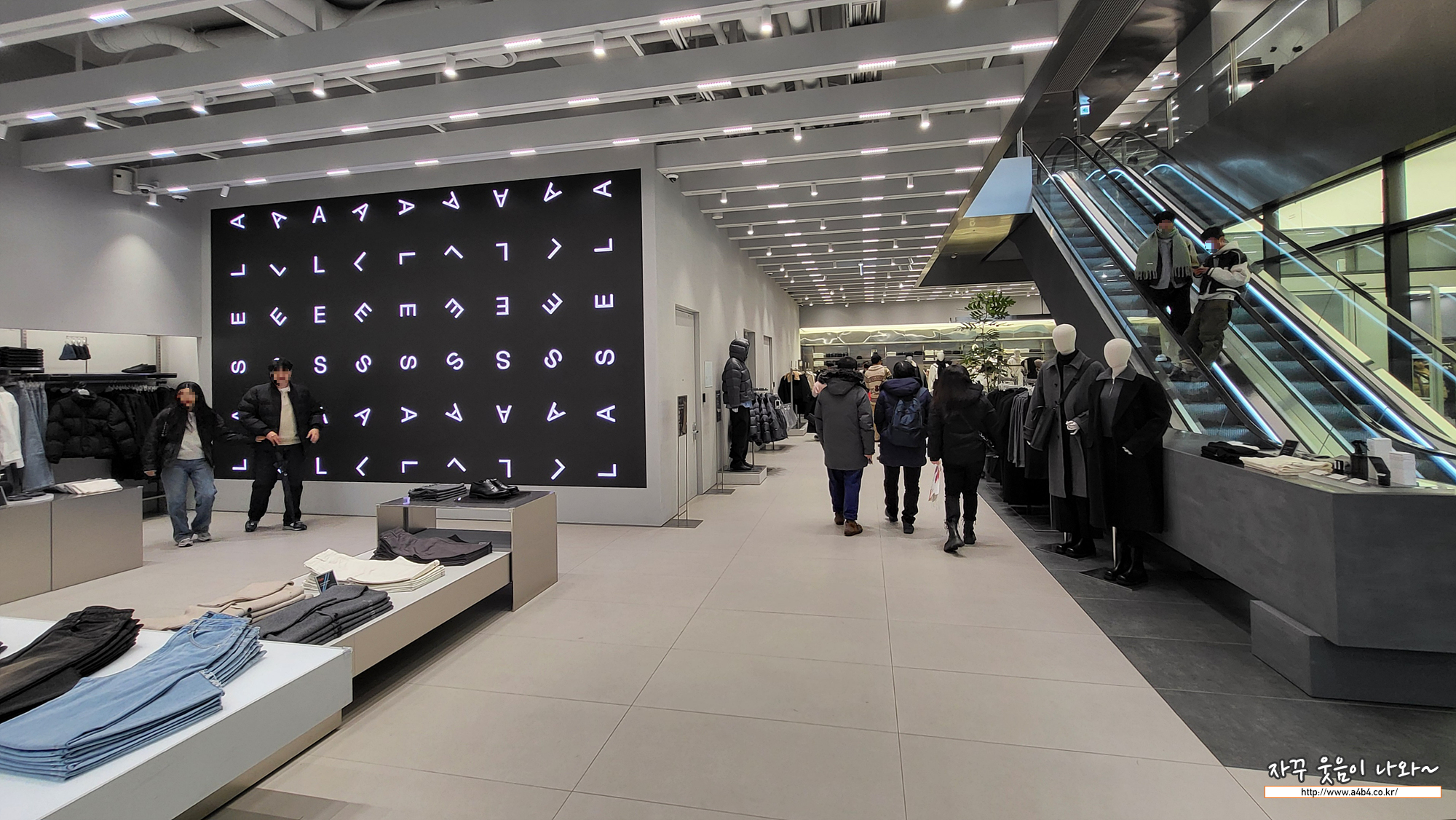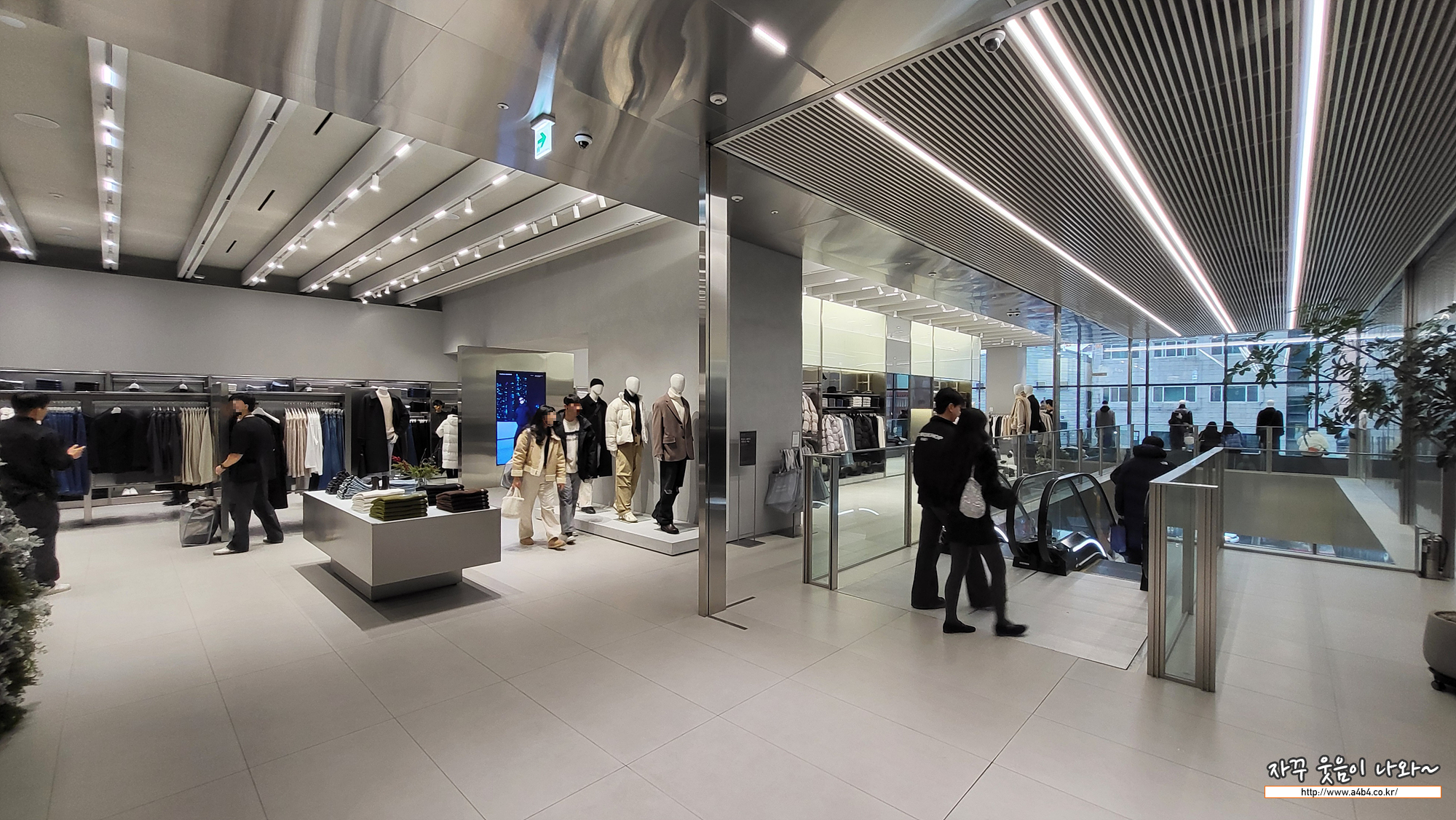 2층은 에스컬레이터로 이동하며, 2층에는 남성의류와 피팅룸이 준비되어 있습니다.