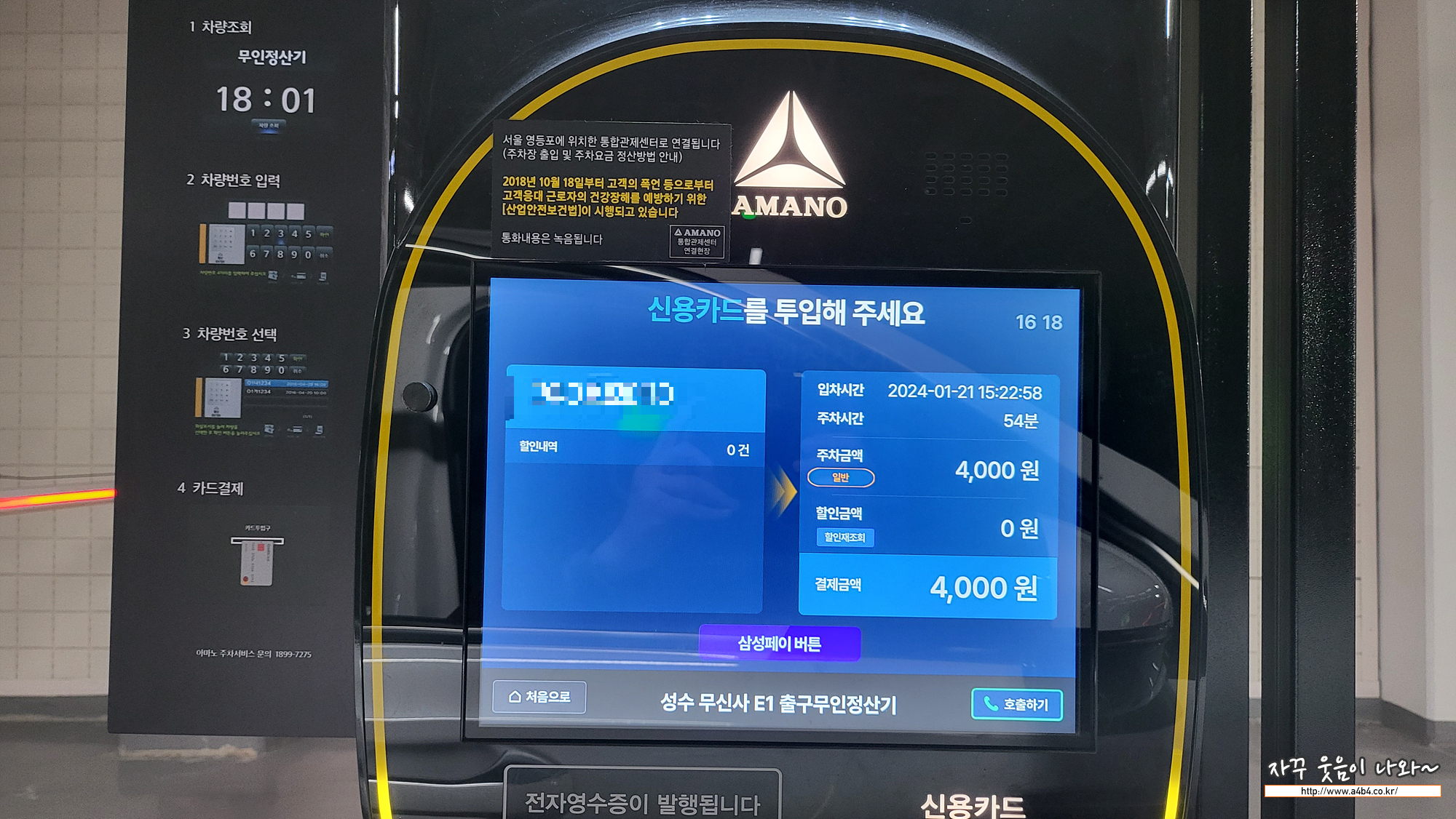 주차요금은 기본 30분 무료, 추가 15분당 1,000원 입니다. 일 주차는 40,000원 입니다. 한 시간 주차요금 4,000원 생각하시면 됩니다. 저는 54분 주차했는데 주차요금 4,000원 청구되었습니다. 구매여부와 상관없이