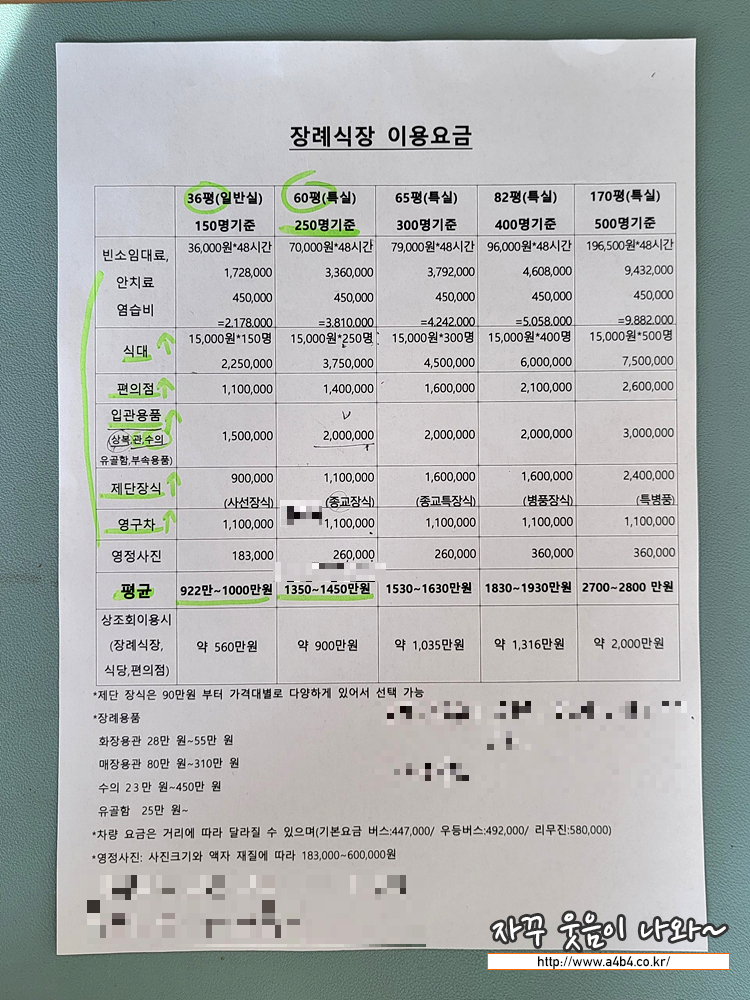 평형별로 이용요금 차이가 있는데요. 아래와 같이 36평형 150명 기준으로 약 10,000,000원, 60평싱 250명 기준으로 약 14,000,000만원 300명 기준 65평 15,000,000만원 정도의 상성병원 장례식장 이용요금이 발생합니다.