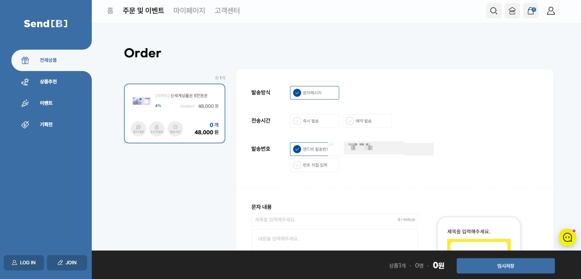 센드비 발송메뉴 입니다. 먼저 발송하고자 하는 기프티콘을 선택하고, 몇 가지 옵션 선택하고, 답례용 기프티콘을 받으실 분들의 전화번호를 수동 입력하거나, 엑셀로 업로드하면 됩니다. 이후 실시간 발송 또는 예약발송 선택하면 됩니다.