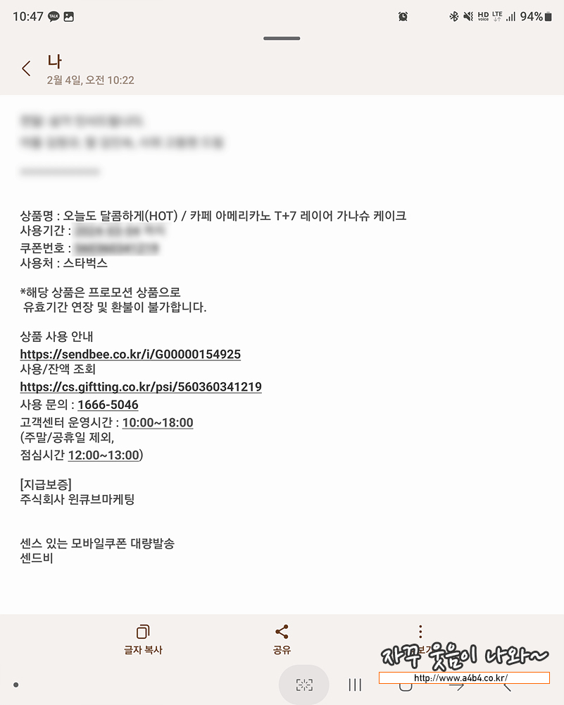 기프티콘 예약발송 시간이 되니 성공적으로 발송되었습니다.