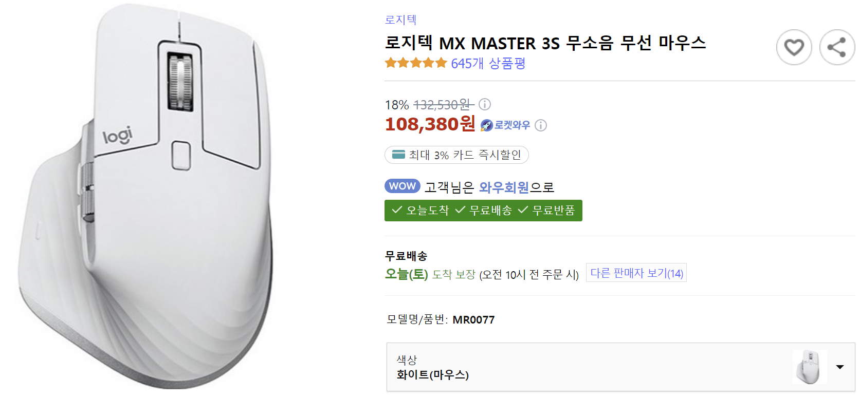 로지텍에서는 마우스와 카보드 등 컴퓨터 주변용품이 저가부터 고가라인까지 다양하게 준비되어 있는데요. 오늘 리뷰하는 Logitech MX Master 3S 마우스는 이중에서도 고가 라인에 속하는 제품입니다. 특히 MX Keys 키보드 등과 같이 MX 고가 라인에 속하는 제품입니다. 온라인쇼핑몰에서는 쿠팡이 가장 저렴한 가격과 짭 구매에 대한 걱정없이 구입할 수 있는데요. 가격은 로켓와우 기준 108,380원입니다.