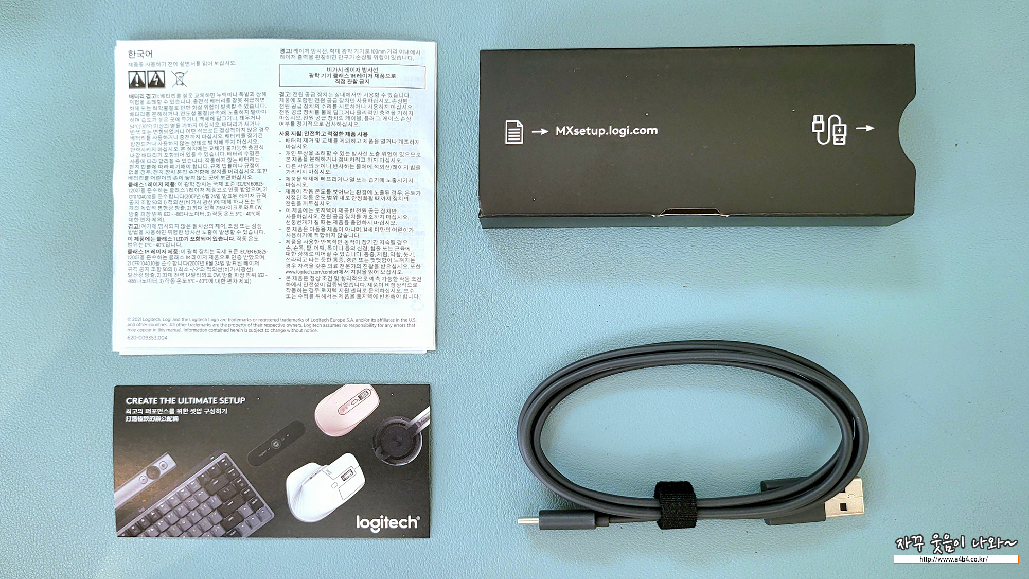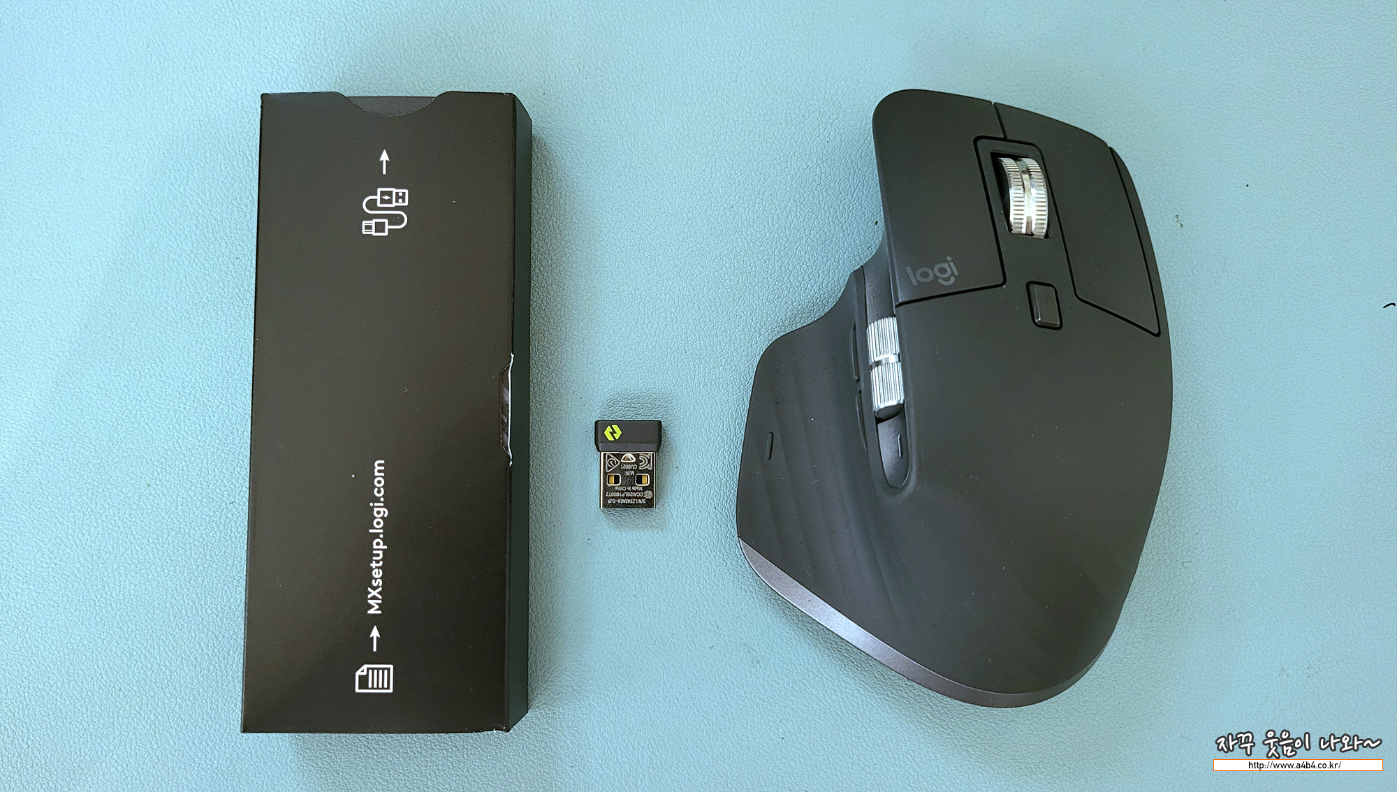 고가 마우스답게 가위없이는 개봉이 어렵다는 플라스틱 일체형 포장이 아닌 검정 박스에 고급스럽게 포장되어 있습니다. 개봉하면 먼저 로지텍 MX 마우스와 로지텍 볼트 둥글이 보입니다.