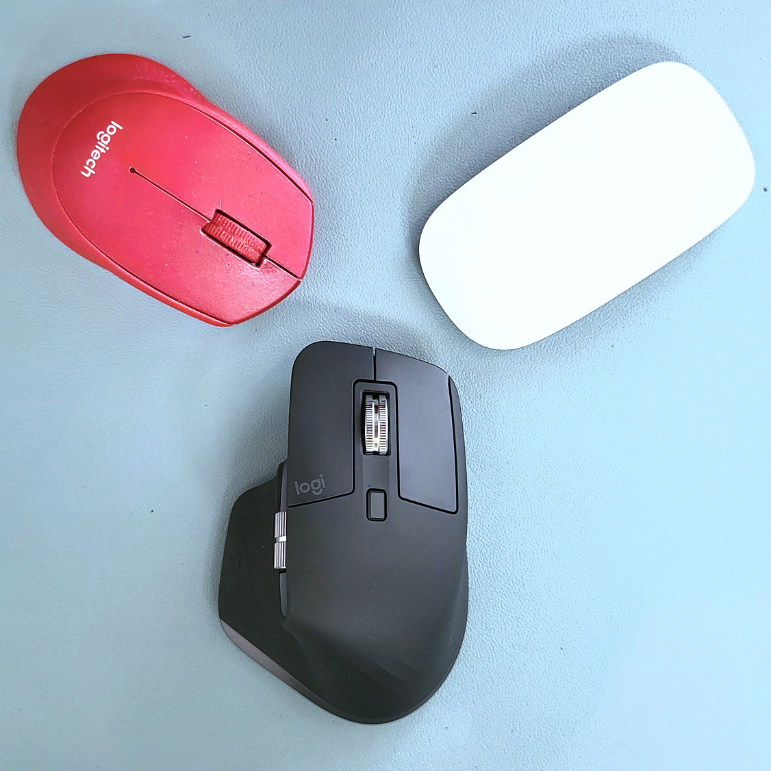 제가 사용하고 있는 다른 마우스와 비교입니다. 붉은색 제품이 로지텍 M331 마우스. 흰색 제품이 애플 매직마우스2 인데요. 상대적인 크기와 높이, 휠과 버튼의 크기를 느끼실 수 있습니다. 3종 제품중에서는 Logitech MX Master 3S 마우스 그립감과 사용감이 가장 좋습니다만 손이 작으신 분들에게는 어떤 그립감이...