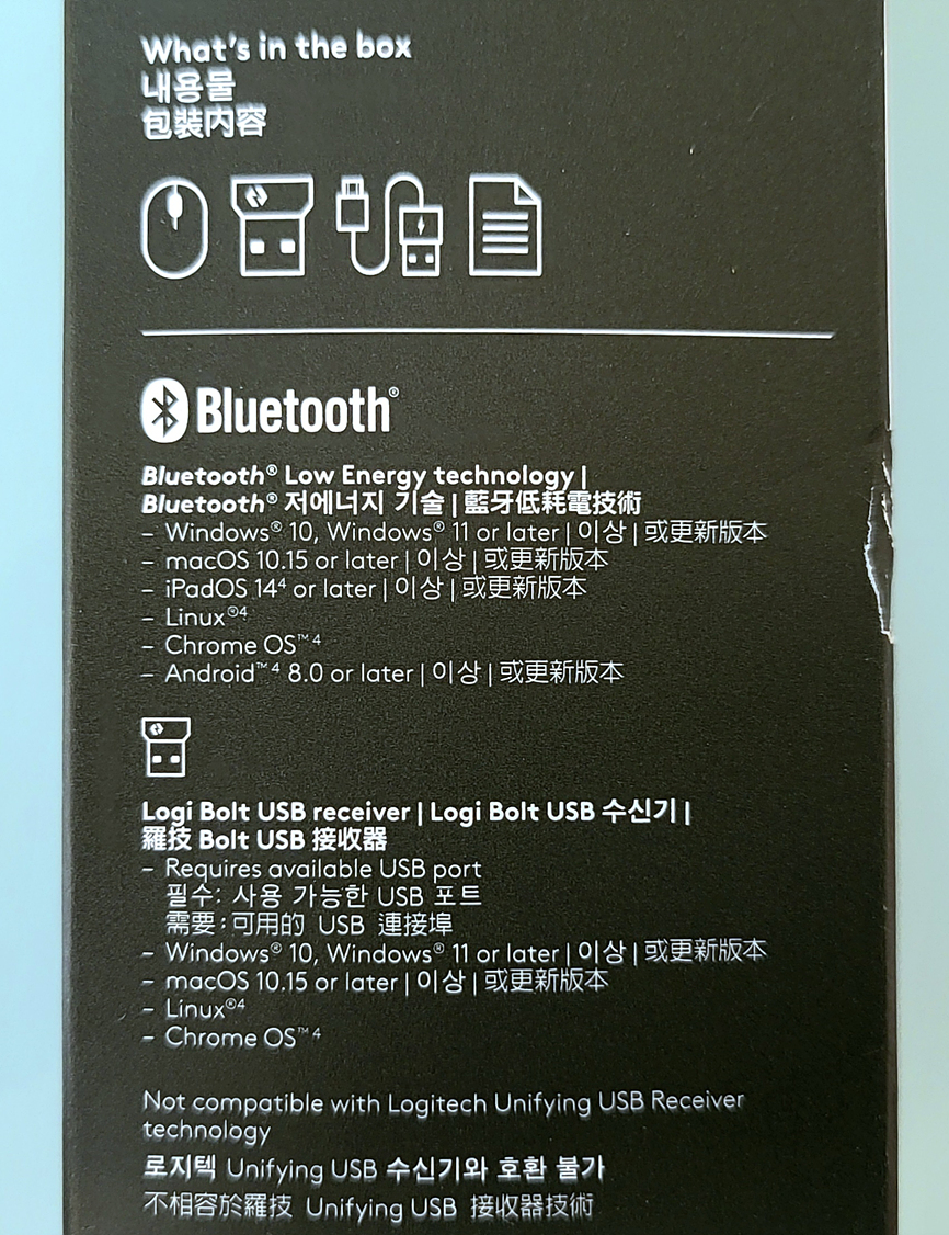 동봉된 수신기는 로지텍 최신 둥글인 로지 볼트 수신기가 들어 있습니다. 노트북을 사용한다면 블루투스 연결로 필요 없지만 블루투스가 지원되지 않는 데스트탑 PC 등에서는 꼭 필요한 녀석입니다. 다만 이전에 제공되던 Logi Unifying USB 수신기가 보안 문제로 단종되면서 Bolt로 변경 되었지만, 하위 수신기와는 호환되지 않습니다.