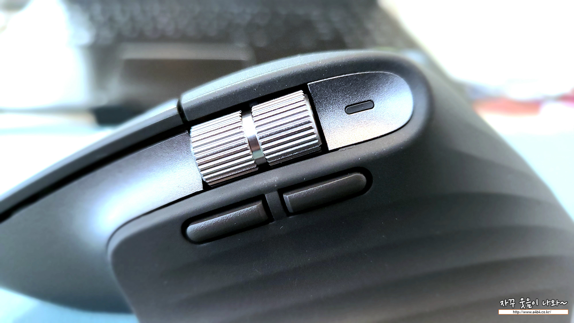 충전중에는 이렇게 가로휠 옆에 램프에서 충전중 - 충전완료 표시되며, 충전하면서 마우스 사용이 가능합니다.