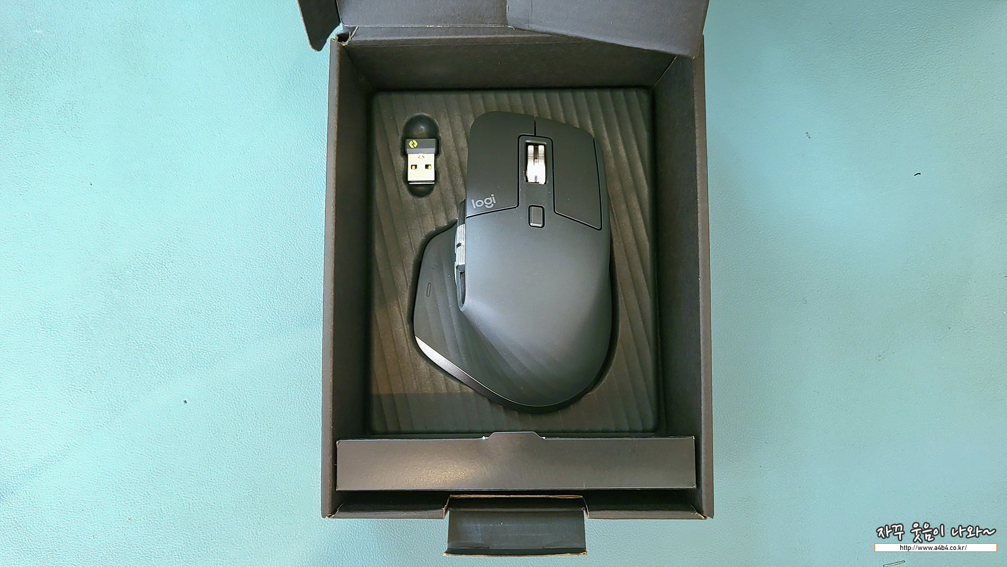 고가 마우스답게 가위없이는 개봉이 어렵다는 플라스틱 일체형 포장이 아닌 검정 박스에 고급스럽게 포장되어 있습니다. 개봉하면 먼저 로지텍 MX 마우스와 로지텍 볼트 둥글이 보입니다.