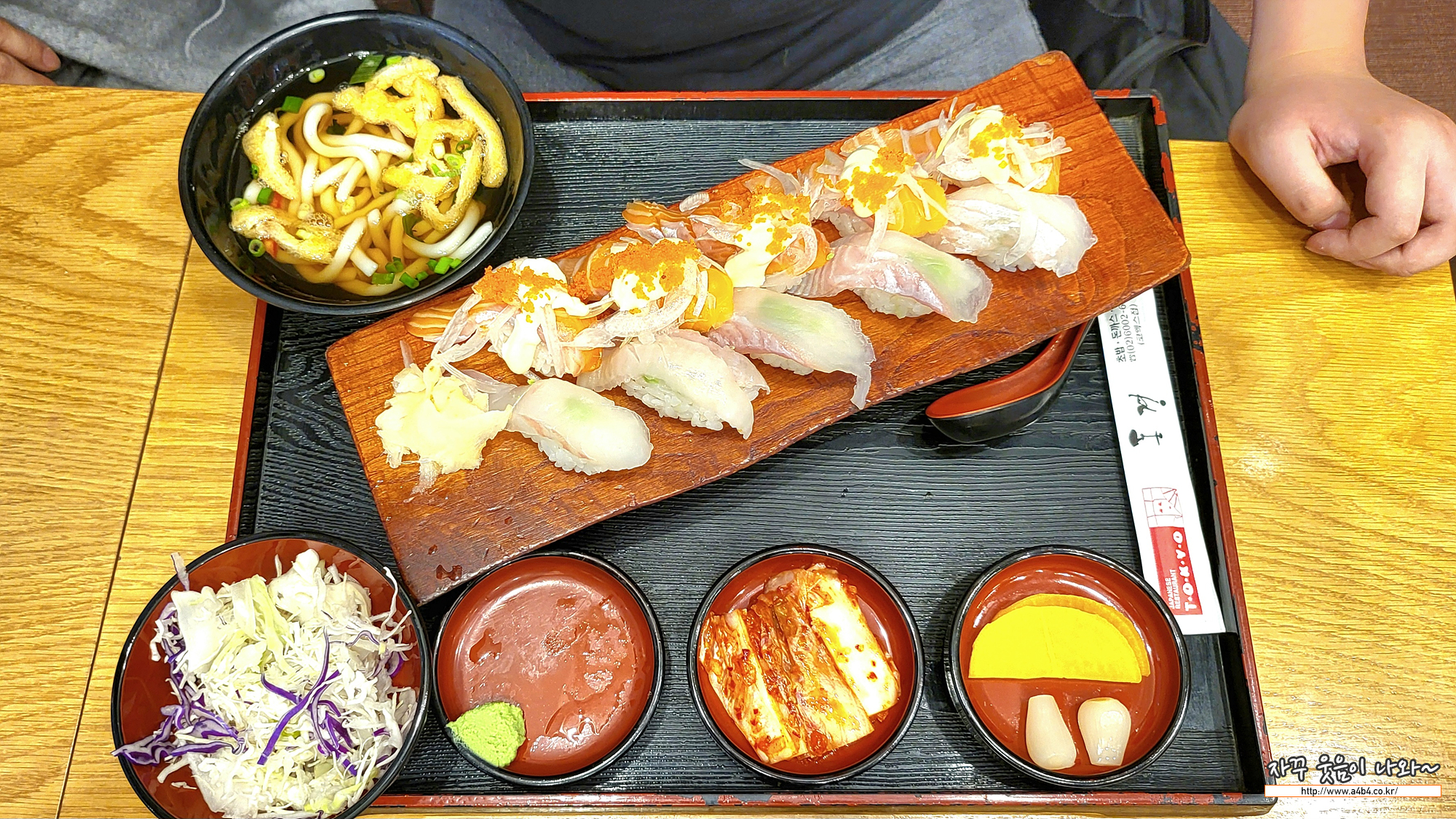 연어초밥과 광어초밥 각각 5조각에 작은 우동이 나오는 세트입니다.