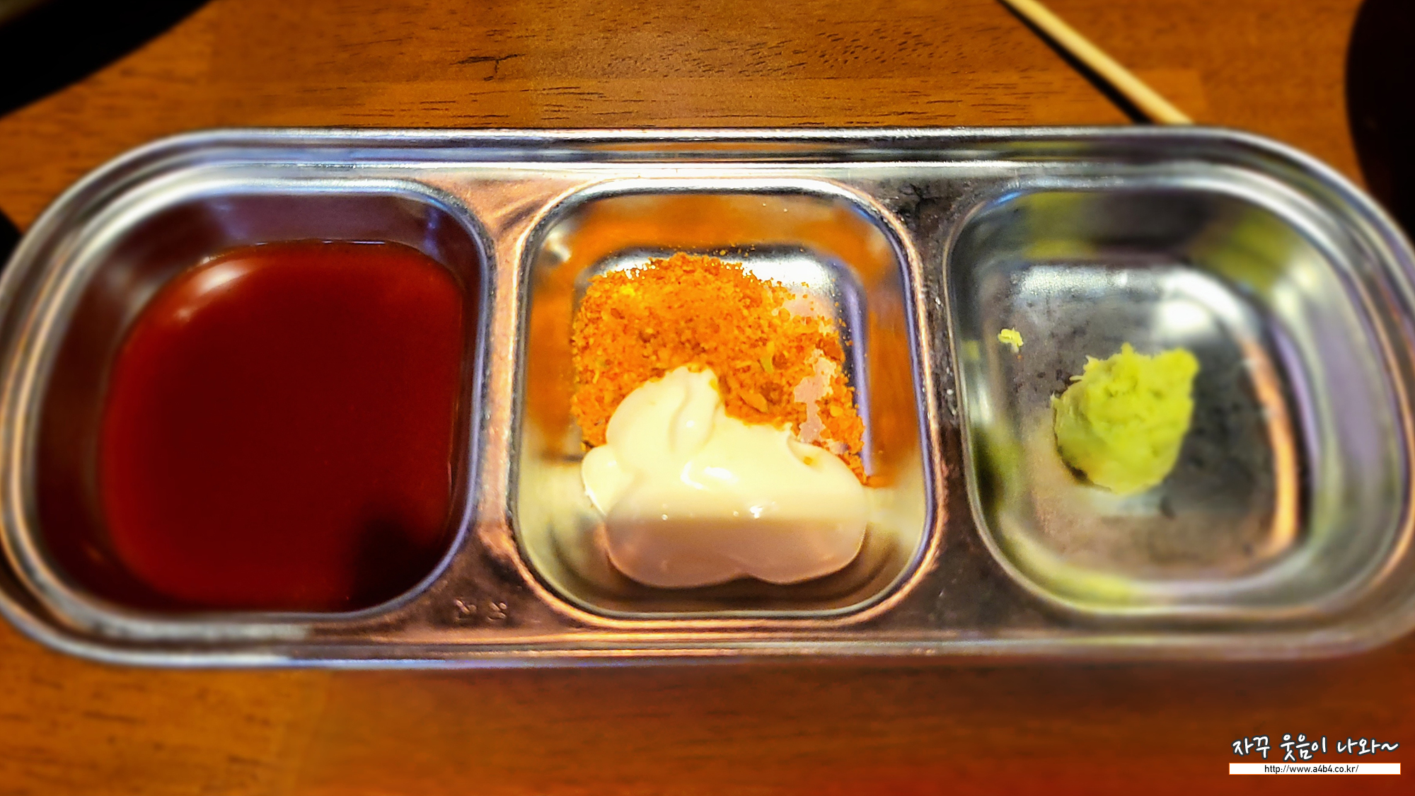 1인용 화로에 올려 나오고요. 주방에서 이미 구워 나오니 꼬치가 따뜻하게 유지되는 역할을 합니다. 그리고 아래와 같이 소스 3종이 나오는데요. 저는 소스를 그렇게 좋아하지 않아 꼬치맛 그대로 즐겼네요.