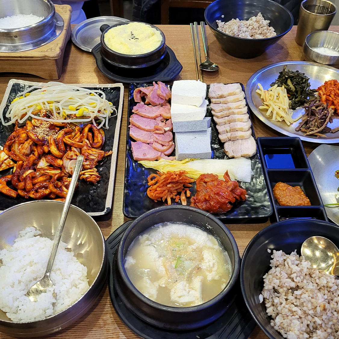 잠실 롯데월드몰 맛집 장안정에서 두부 한정식을 주문하면 솥밥이 나온다고 했는데요. 오징어쌈밥정식을 주문하면 솥밥이 아닌 보리밥이 나옵니다. 솥밥의 누릉지가 생각난다면 밥을 솥밥으로 변경 가능합니다. 물론 1,000원 추가