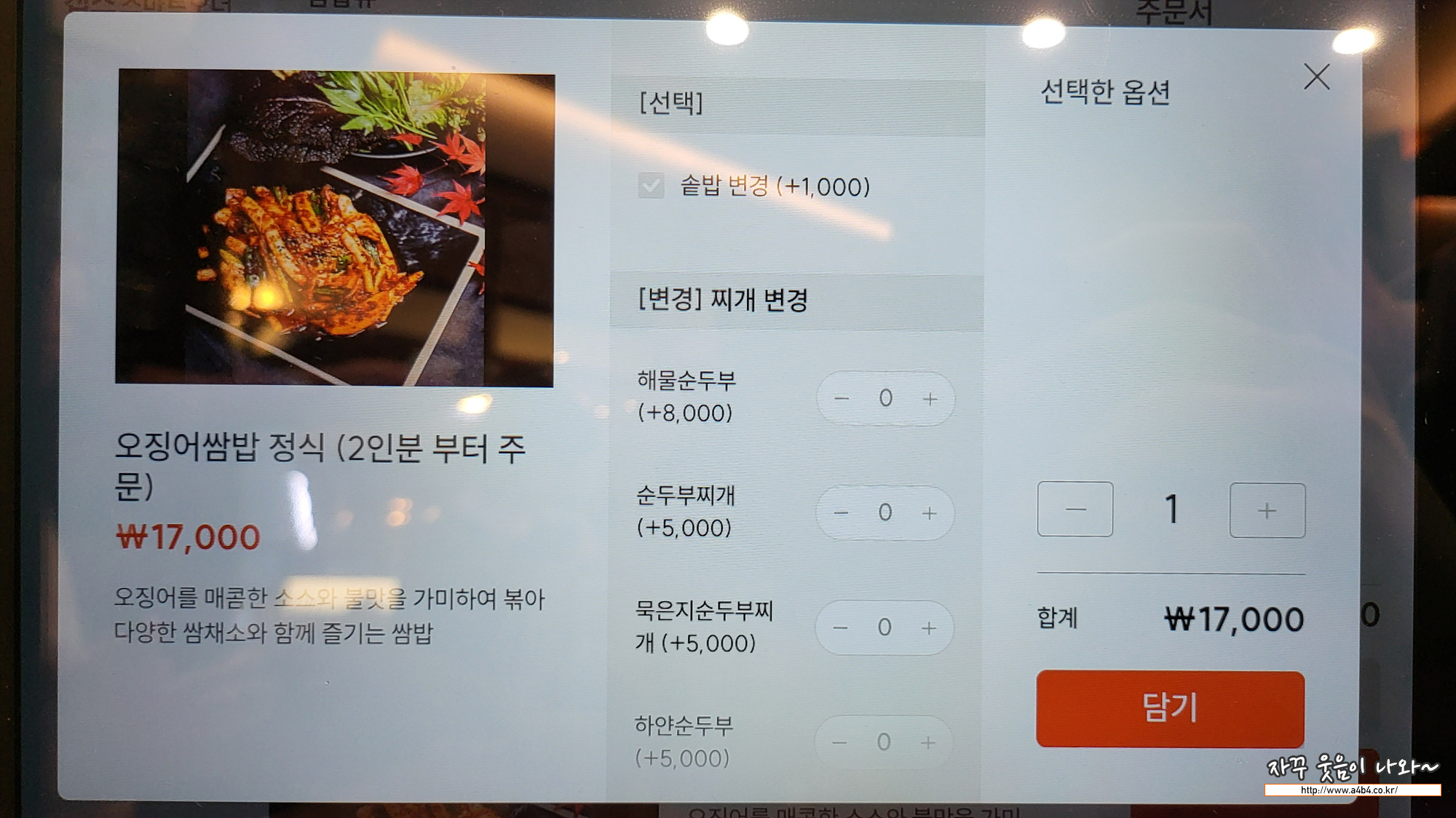 저희는 두부한정식 2인분과 오징어쌈밥정식 2인분 주문합니다.