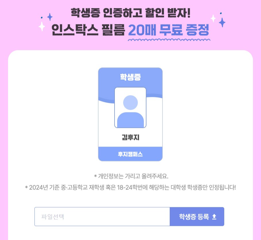 현재 후지필름몰에서는 여러가지 할인 프로모션을 진행하고 있는데요. 크게 혜택볼 수 있는 두 가지 프로모션이 있습니다. 먼저 인스탁스 공식몰에 새로 가입하면 100,000원 이상 구매시 20,000원 할인쿠폰이 발행됩니다. 만약 이미 가입하셨다면 가족 동원해서 신규 가입하시면 됩니다. 여기에 학생증 인증을하면 인스탁스 미니 필름 20매 무료쿠폰이 지급됩니다.