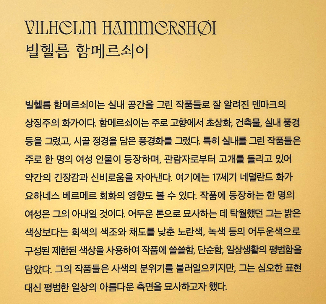 빌헬름 함메르쇠이는 덴마크의 상징주의 작가로 실내 공간을 그린 작품으로 잘 알려저 있다고 한다.