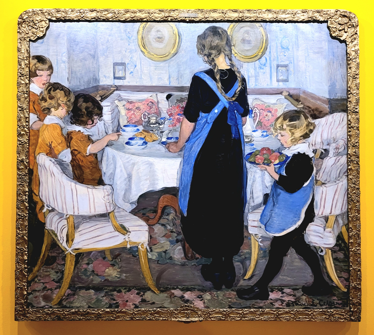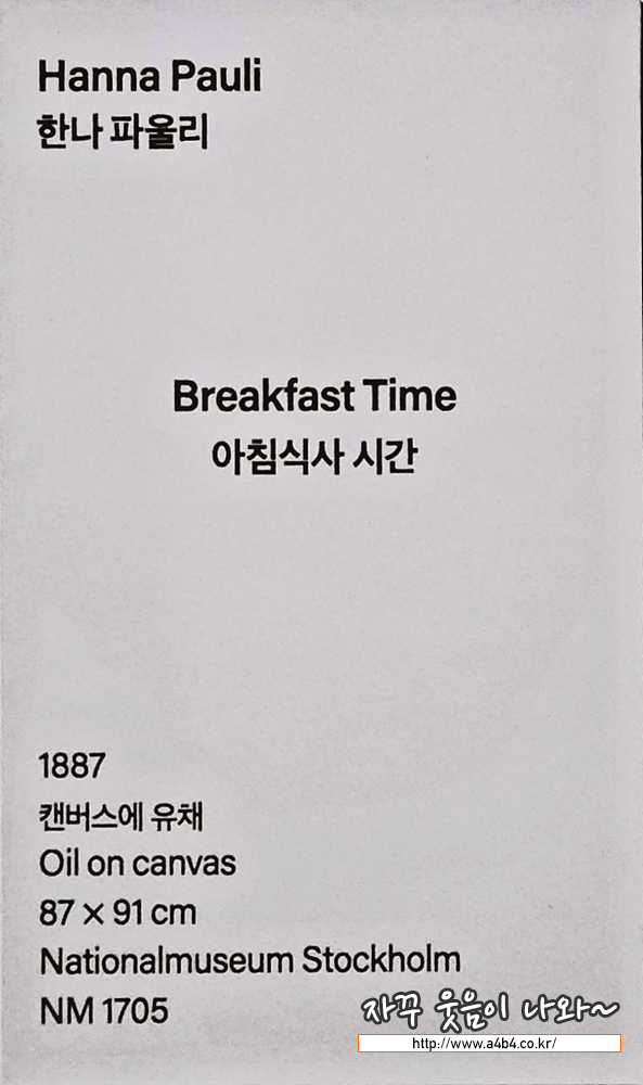 한나 파울리는 파리 유학 시절 동시대 스웨덴 화가들이 모여 있었던 그뢰즈 쉬르 루앙에서 게오르그 파울리를 만나 1887년 에 결혼했습니다. 같은 해 제작된 이 작품은 풍경화, 정물화, 초상화를 혼합한 듯한 색다른 구도 안에서 야외의 아침식사 시간 을 묘사합니다. 정원의 나뭇잎 사이로 드리워진 빛이 식탁 위 정물에 어룽거리고, 아름다운 것들로 가득한 테이블은 가족 혹 은 가정생활을 떠올리게 합니다. 이에 대해 당시 스웨덴의 비평가는 그녀의 기술이 너무나 현대적이라 평가했고, 식탁보에 드 리운 빛 표현에 대해 "붓으로 닦아낸" 흔적이라 추측하기도 했습니다.
