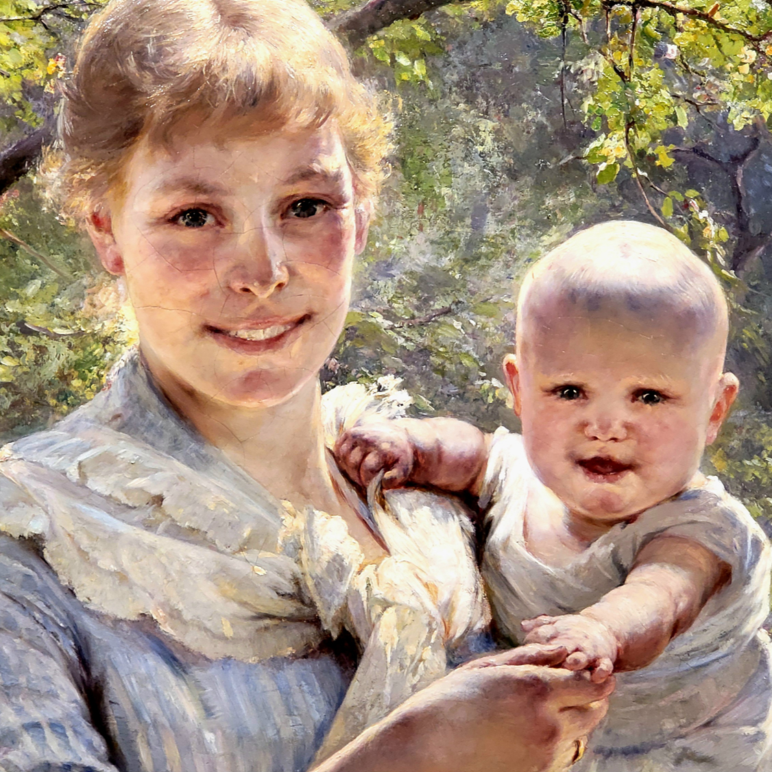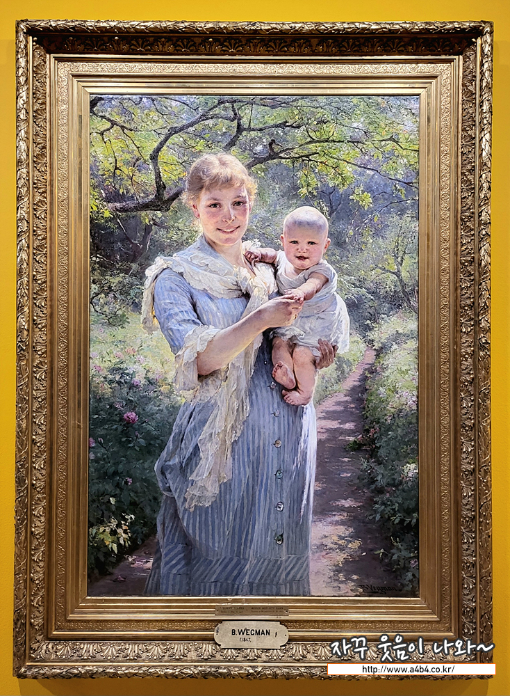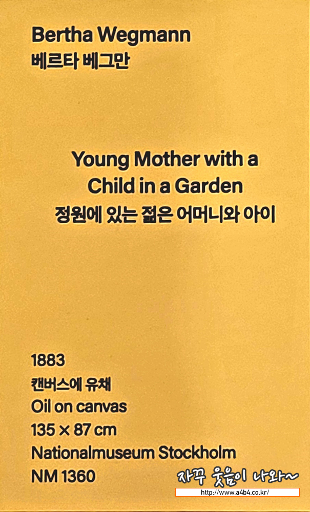 베르타 베그만은 스위스 혈통의 덴마크 초상화가입니다. <정원에 있는 젊은 어머니와 아이> 는 따뜻한 햇별을 쬐며 환하 게 웃고 있는 여성과 아이를 묘사하고 있습니다. 아이는 왼손으로 어머니의 옷자락을, 오른손으로는 어머니의 손을 맞잡고 있 습니다. 사실적인 묘사가 살아있는 나무와 자연의 디테일은 아득히 사라지는 듯한 정원의 원근감과 함께 어머니와 아이에 게 생동감을 줍니다.