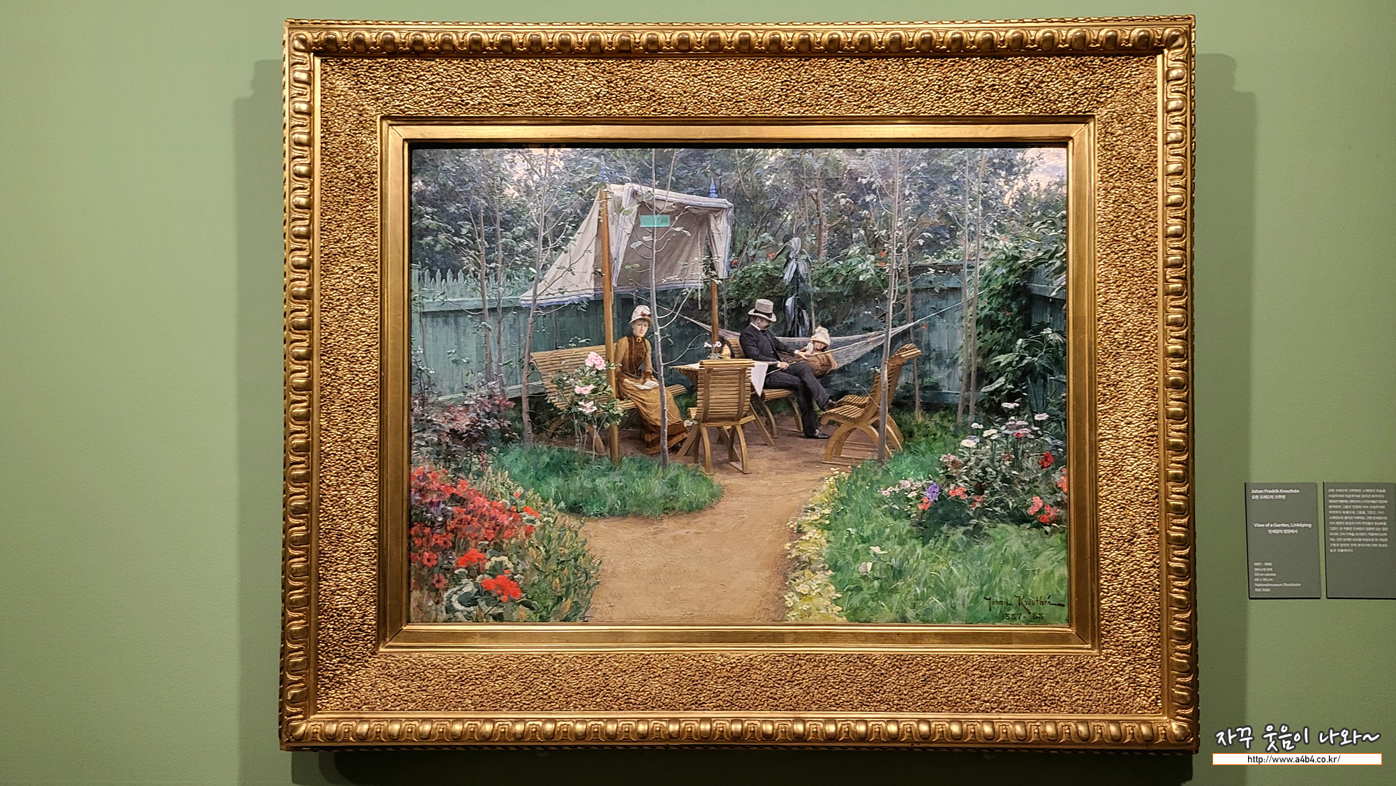 요한 프레드릭 크루텐은 스웨덴의 모습을 사실주의와 이상주의로 담아낸 화가입니다. 드로잉과 인물화, 조경을 공부한 크루텐은 짧은 기간 동안 프랑스에 머물렀고, 스웨덴으로 돌아온 이후에는 고향 린셰핑에서 정원 풍경과 지역 주민들의 초상화를 그렸습니다. 1880년대 프랑스 미술에 영향을 받은 이 작품은 그의 초기작 중 하나로, 린셰핑의 정원에 있는 젊은 의사와 그의 가족을 그려내고 있습니다. 크루텐은 상세한 묘사를 바탕으로 정원의 모습을 세심하게 구현하며 장면의 분위기를 아름답게 연출하였습니다.