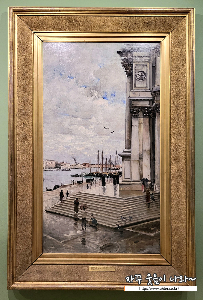 칼 스콘베르그는 프랑스 인상주의와 외광 회화에 열정을 가지고 있었던 스웨덴의 화가입니다. 그는 프랑스 미술에 대한 열정 뿐만 아니라, '회색 화파'라고도 불린 네덜란드 '헤이그 화파'에도 영향을 받으며 여타 풍경화와 구별되는 색채로 스웨덴 풍경 화에 신선함을 주기도 했습니다. 이러한 영향이 잘 드러나는 작품 <베니스 대운하> 는 건강이 악화된 스콘베르그가 회복 을 위해 이탈리아로 이주한 시기에 그려졌습니다. 구름 낀 흐린 날, 우산을 쓴 사람들과 물기 있는 땅에 비친 그림자가 대담 한 붓 터치로 표현되어 있으며, 촉촉하게 젖은 지면의 돌은 분위기를 시적으로 만들어줍니다.