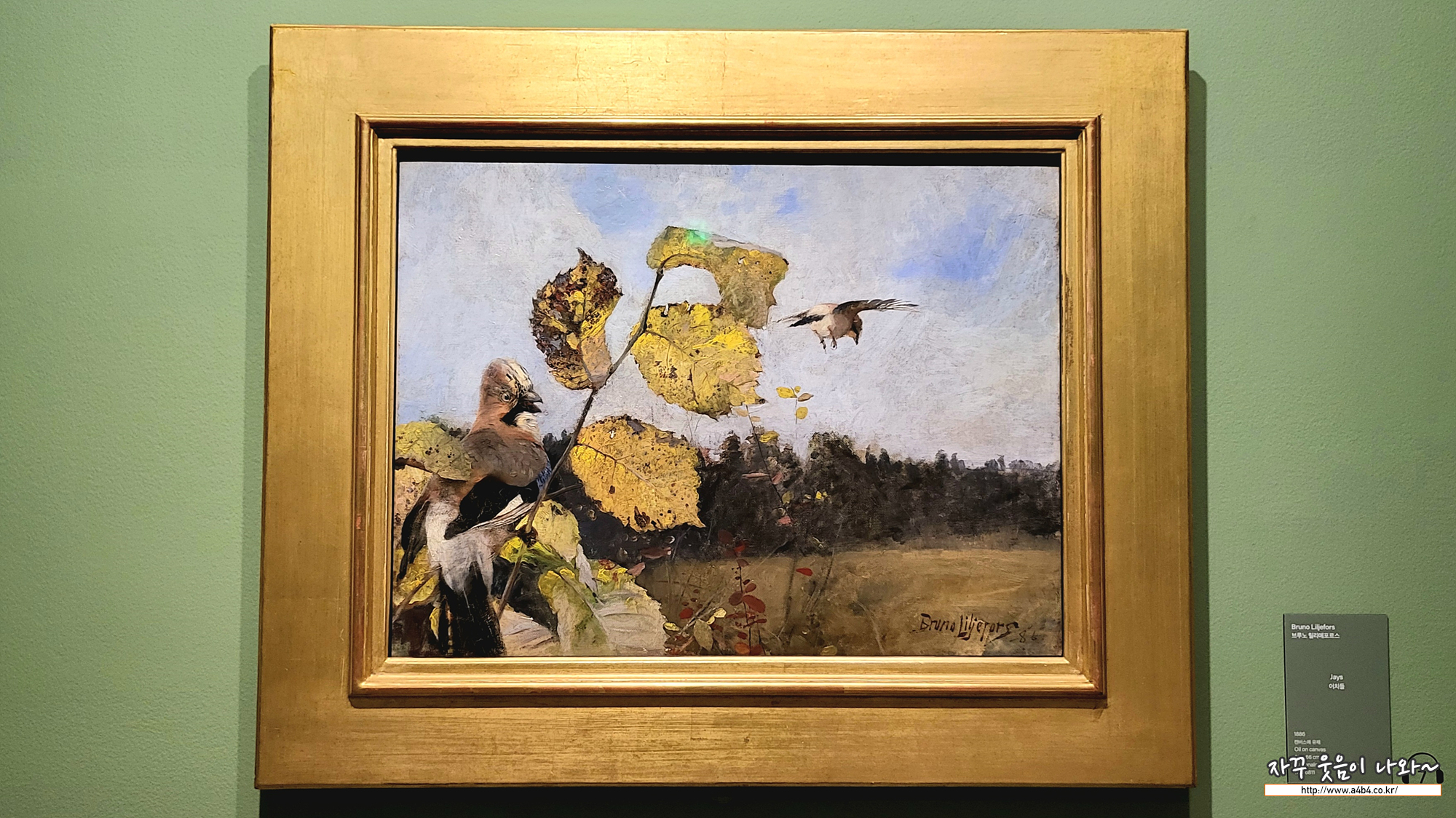 브루노 릴리에포르스는 야생동물을 섬세하게 관찰하여 작품에 담은 스웨덴의 화가입니다. 새가 뛰어오르기 직전 찰나의 순간 을 절묘하게 포착한 작품 <어치들> 은 드라마틱한 상황을 구현하고 있습니다. 마치 새에 초점을 맞추고 찍은 사진처럼, 배경 은 다소 시선이 확산되고 부자연스러워 보이기도 합니다. 새가 앉아 있는 아름답고 장식적인 나뭇가지는 작품 왼쪽에 배치되 어 비대칭적인 구도를 보여주고 있습니다. 또한, 나뭇가지가 세밀하게 묘사된 전경과 어렴풋이 보이는 숲 속 배경 사이의 강 한 대비는 얼어붙은 순간의 긴장된 분위기를 한 층 더합니다.