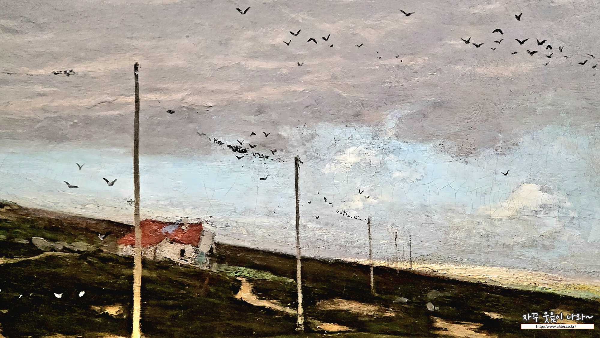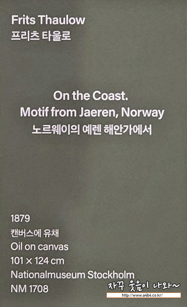 프리츠 타울로는 1880년대 노르웨이 미술의 황금기를 대표하는 화가입니다. 프랑스에서 머무르는 동안 외광 회화에 많은 영 향을 받았고, 그곳에서 크게 성공을 거두기도 했습니다. 이 작품은 자국으로 돌아온 타울로가 노르웨이 남서해안의 예렌에 방 문한 후 이듬해 제작한 작품입니다. 당시 예술가들에게 예렌은 시골 풍경과 해안 풍경에 많은 영감을 주었던 장소였습니다. 타 울로는 예렌의 울퉁불퉁한 해안선을 세심하게 포착하였고, 형태의 묘사보다는 작품의 주제를 선정하는 데 더욱 중점을 두었습 니다. 갈매기들이 앉아 있는 전신주는 당대의 시대성을 반영하고 있습니다.