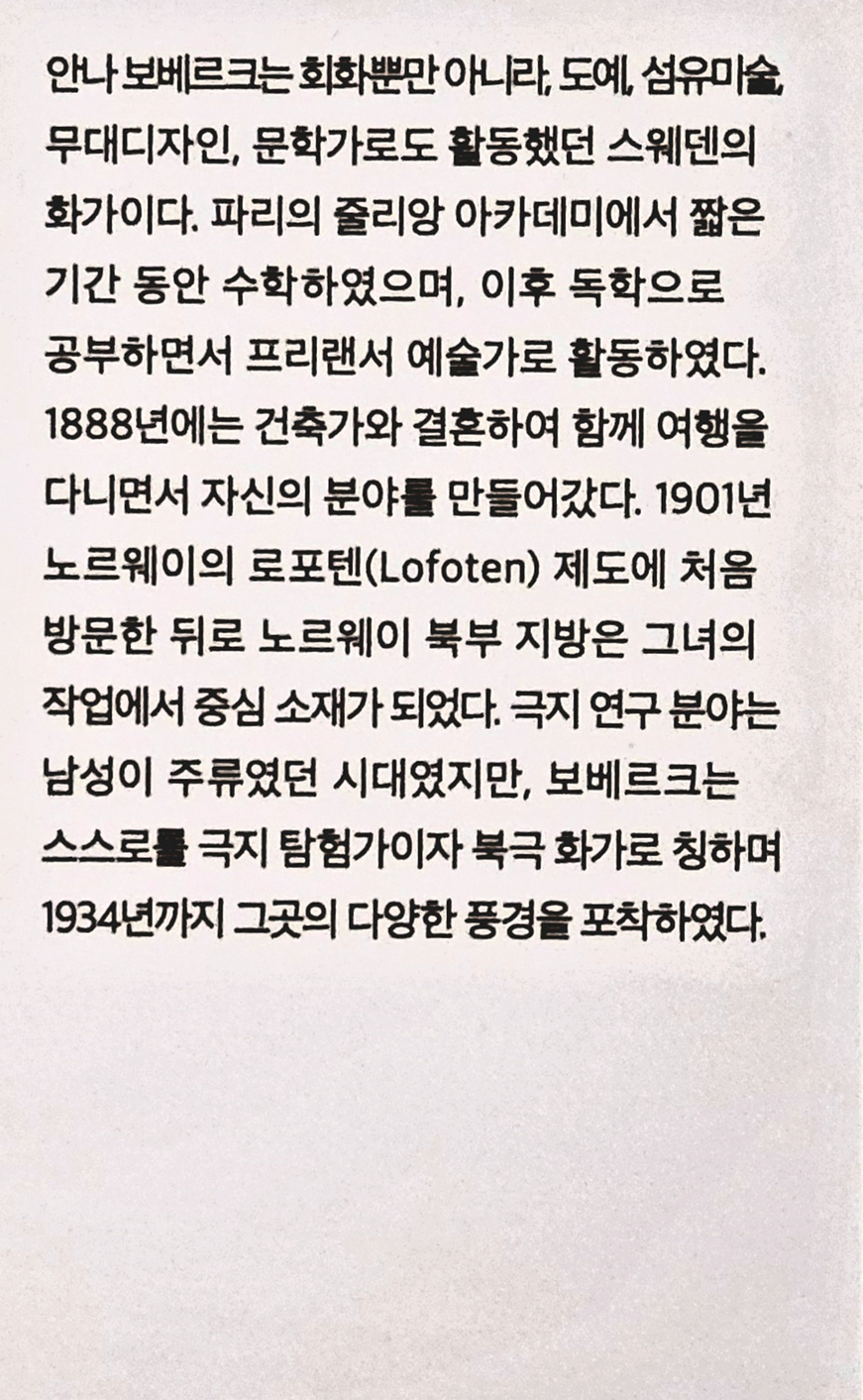 안나 보베르크는 회화뿐만 아니라, 도예와 섬유미술, 무대디자인, 그리고 문학가로도 활동했던 스웨덴의 화가입니다. 보베르 크는 프랑스에서 유학하는 동안 인상주의 화가들의 작품을 접했지만, 당시 주류 미술 경향이나 아카데미 경향을 따르지는 않 았습니다. 건축가와 결혼한 후 함께 여행을 다니며 자신의 분야를 만들어갔던 그녀는 노르웨이의 로포텐 제도에 방문한 뒤 로 노르웨이 북부 지방을 자신의 중심 소재로 삼았습니다. 극지 연구 분야는 남성이 주류였던 시대였지만, 보베르크는 스스로 를 극지 탐험가이자 북극 화가로 칭하며 그곳의 다양한 풍경을 포착하였습니다. 사진 설명을 입력하세요.