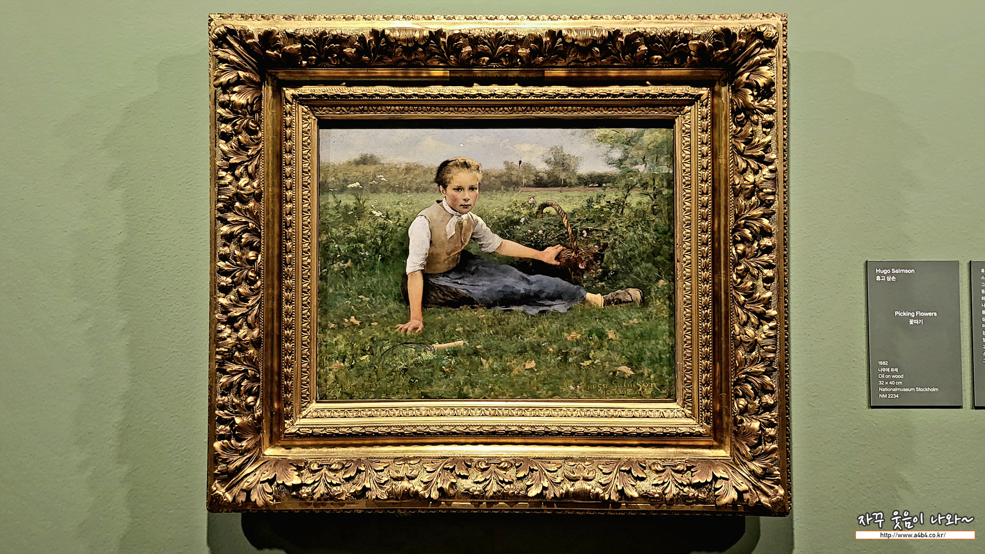 휴고 삼손은 인물화와 풍속화로 잘 알려져 있는 스웨덴의 화가입니다. 외광 회화를 포함한 당대 프랑스 미술에 많은 영향을 받 은 삼손은 스웨덴 화가들 중 가장 프랑스 화풍의 특성이 많이 나타나는 작품을 그린 화가이기도 합니다. 프랑스 북부 피카르 디 지역에 머무르는 동안 그린 이 작품은 자연의 아름다움을 밝고 생동감 있는 색채로 그려내고 있습니다. '들판'이라는 배경 은 프랑스 화가 장 프랑수아 밀레로부터 다루어지면서 프랑스 자연주의 미술의 중심 소재가 되었습니다. 발강게 상기되어 있 는 얼굴의 소녀는 소매를 걷어올리고 한참 꽃을 따다 쉬고 있는 모습입니다. 짙은 눈두덩이에는 고단함이 다소 배어있으며, 시 선은 생활고로 인한 삶의 무게, 그리고 더 넓은 시야를 향한 열망을 반영하고 있습니다.