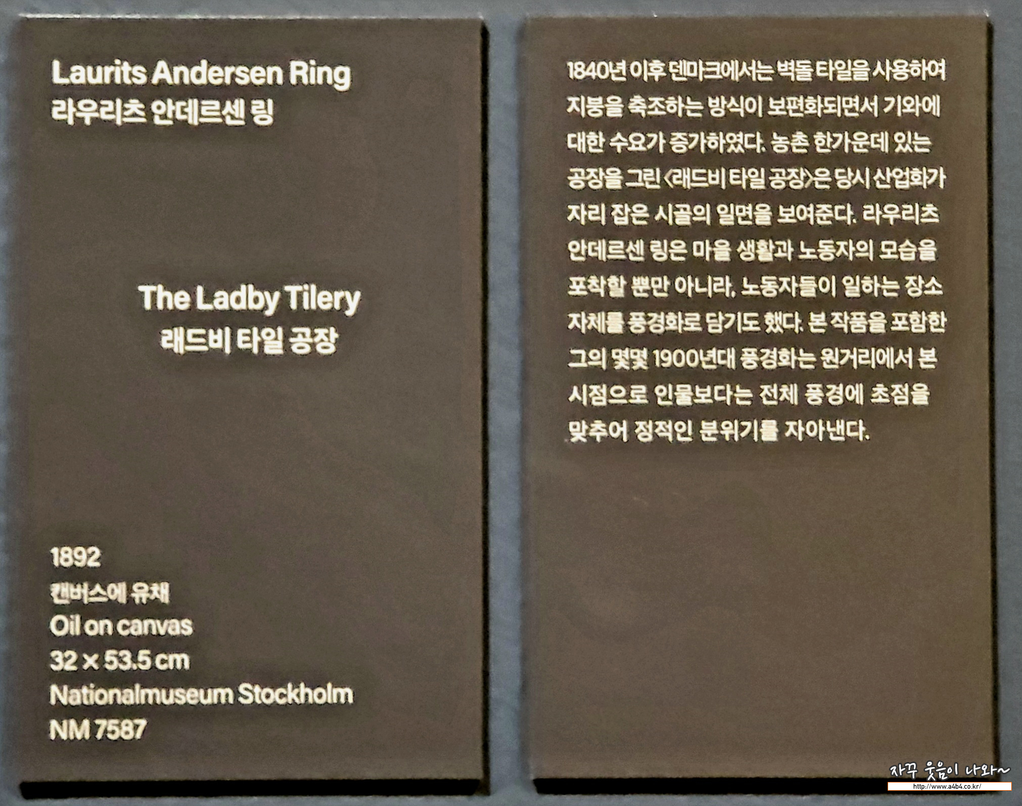 라우리츠 안데르센 링은 덴마크 미술계를 선도한 화가들 중 한 명이자 상징주의와 사회적 사실주의를 개척한 화가입니다. 초 기에는 주로 농부, 노동자, 소외된 사람들의 삶, 시골 생활의 현실을 보여주는 작품을 제작하였고, 이 작품과 같이 노동자들 이 일하는 장소 자체를 풍경화로 담기도 했습니다. 1840년 이후 덴마크에서는 벽돌 타일로 지붕을 짓는 방식이 보편화되면 서 기와를 많이 제작하기 시작했는데, 농촌 한가운데 공장을 배치한 <래드비 타일 공장> 은 당시 산업화가 자리 잡은 시골 의 일면을 보여주고 있습니다. 사진 설명을 입력하세요.