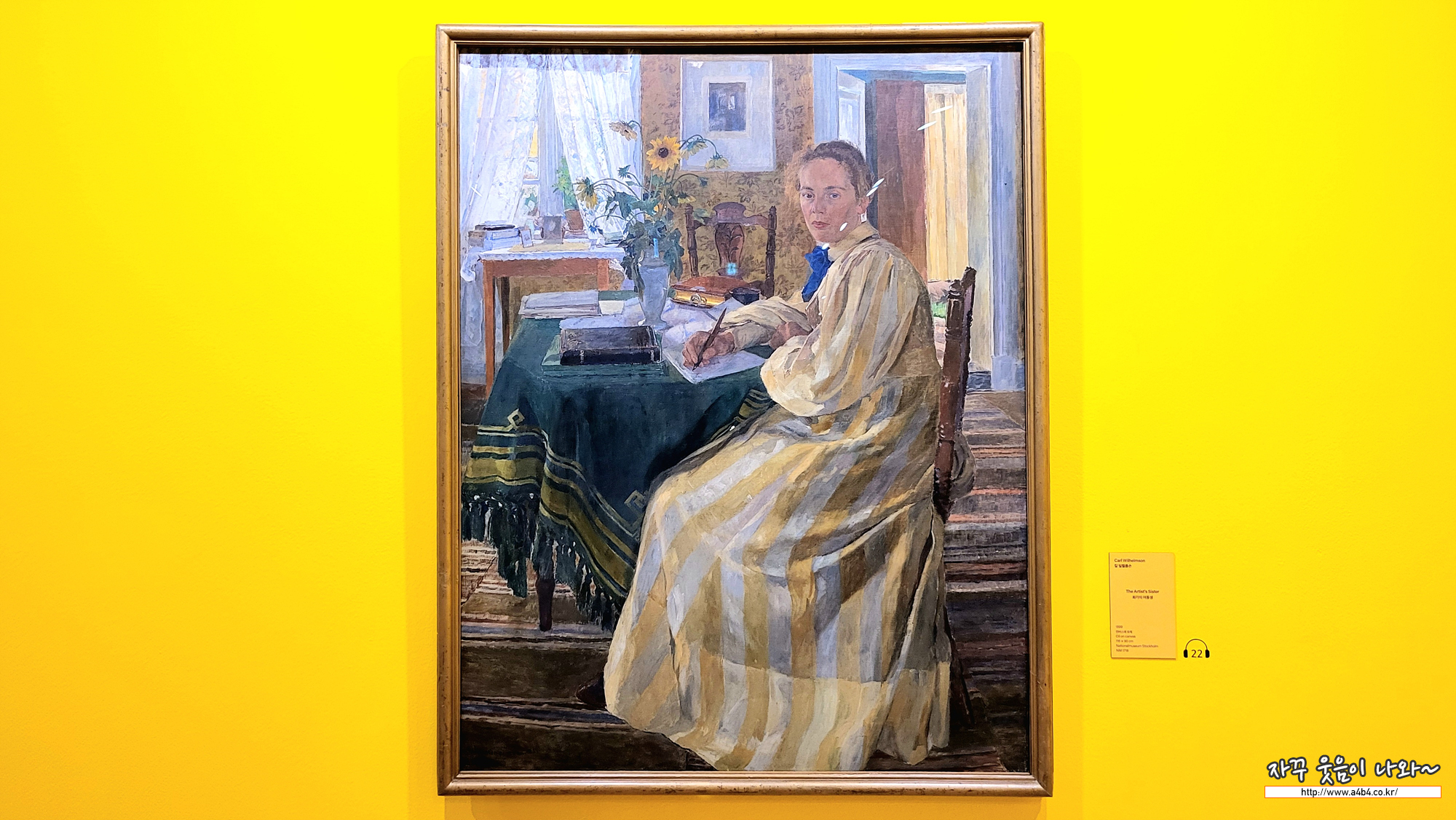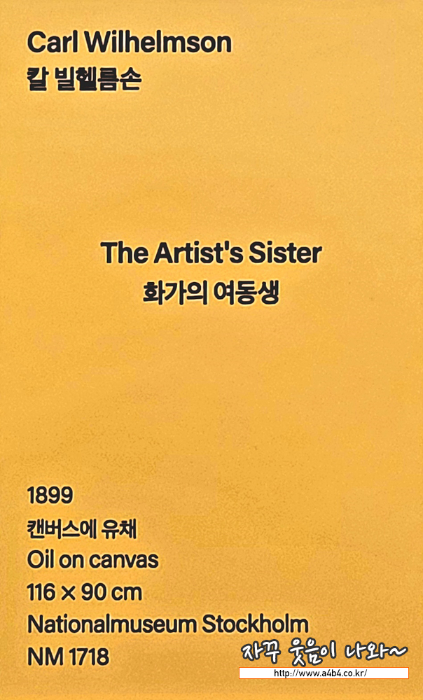 칼 빌헬름손은 스웨덴의 화가이자 석판 인쇄공입니다. 프랑스에서 수학한 후, 스웨덴으로 돌아온 그는 주로 고향 보후슬렌 과 예테보리의 어촌 풍경, 그리고 마을 사람들을 그렸습니다. <화가의 여동생> 은 화가의 여동생 안나가 테이블에 앉아 편지 를 쓰고 있는 모습을 그린 작품입니다. 여동생 안나가 입고 있는 드레스, 꽃 등 화면 가득 채워진 노란색은 창문의 레이스 커튼 과 열린 문 사이로 밝게 들어오는 햇빛과 함께 방 전체에 따스함을 전해주고, 목가적인 여름의 분위기를 자아냅니다.