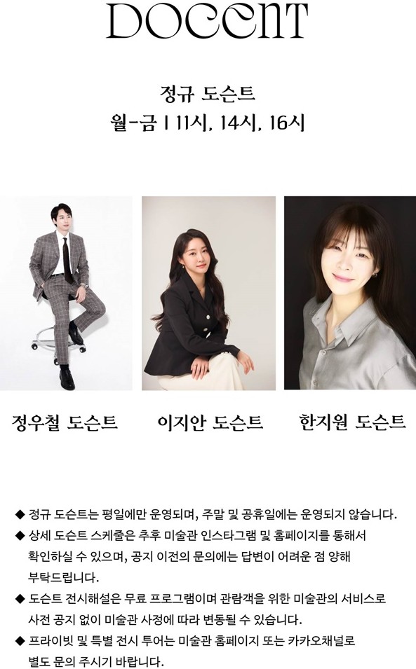 새벽부터 황혼까지 - 스웨덴국립미술관 컬렉션 도슨트는 정우철, 이지안, 한지원 도스트님을 만나볼 수 있습니다. 펼일인 월요일부터 금요일까지 오전 11시 오후 2시와 4시 하루 세 번 진행됩니다. 아쉽게도 주말 도슨트는 없네요.