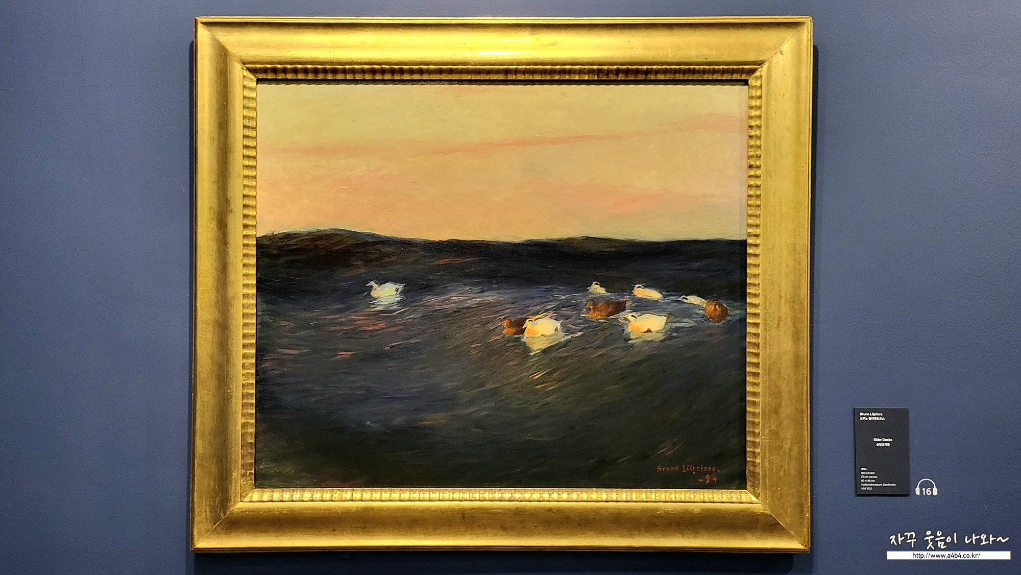 1890년 브루노 릴리에포르스의 화풍은 커다란 변화를 맞이했습니다. 자연주의의 상세한 묘사 대신 넓은 붓질로 채색하 는 이 새로운 기법은 특히 물을 표현하는 데 효과적이었습니다. 넓은 붓질은 부드러우면서도 리듬감이 느껴지고, 강한 파도 의 움직임을 잘 드러내어 줍니다. 먼 곳에서부터 밀려오는 파도의 움직임은 오리에게 운동감을 더해주고, 해가 지고 있는 분홍 빛의 하늘은 깊고 짙은 해수면의 모습을 더욱 강조합니다.