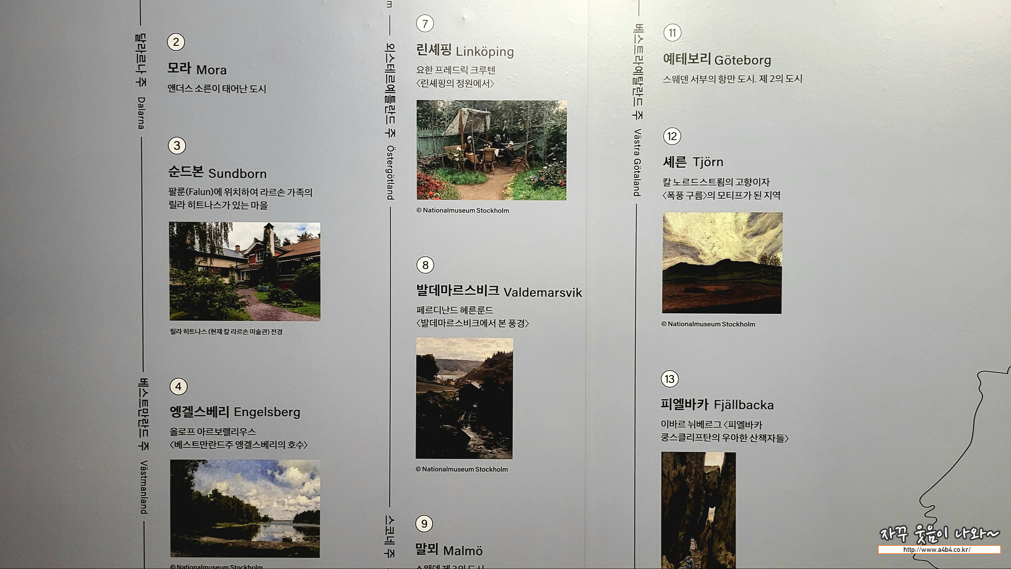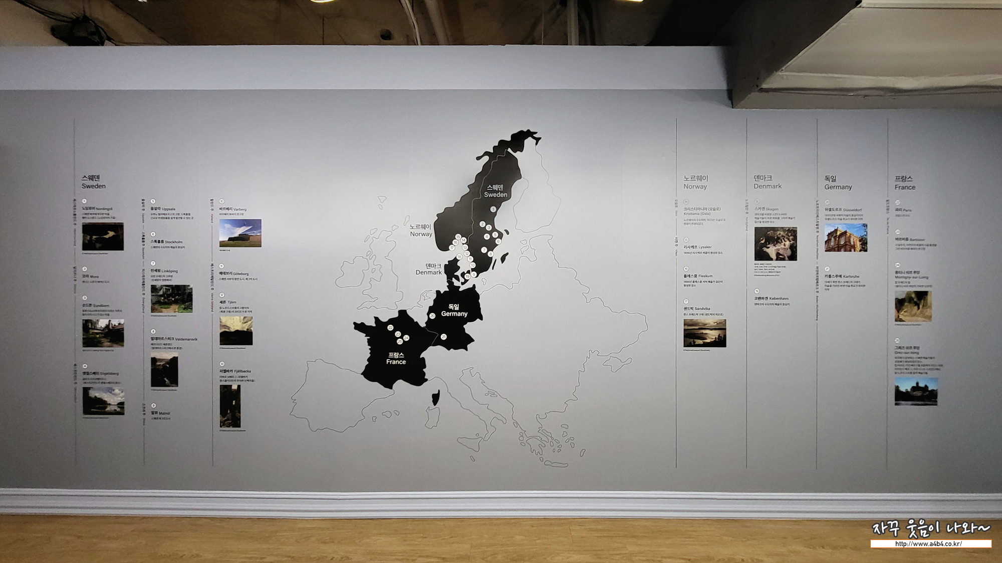 북유럽 지도, 스웨덴, 덴마크, 노르웨이, 독일, 프랑스 지도에 예술가들이 활동하던 지역과 주요 작품의 배경이 된 지역들이 사진과 함께 설명되어 있습니다.
