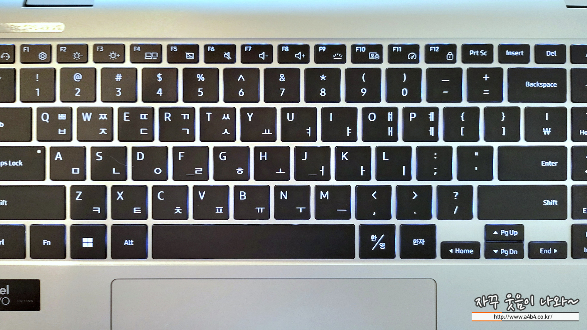 노트북이 크다 보니 키보드 자판도 일반 PC에서 사용하는 키보드 자판과 배열 및 간격이 동일합니다. 이 부분은 회사나 집에서 키보드를 사용하다가 바로 노트북 키보드를 사용해도 적응시간 필요 없이 바로 오타 없는 타이핑이 가능한 장점을 가지고 있습니다. 아래 로지텍 MX 키보드와 비교하면 자판 간격이 동일한 것을 볼 수 있습니다.