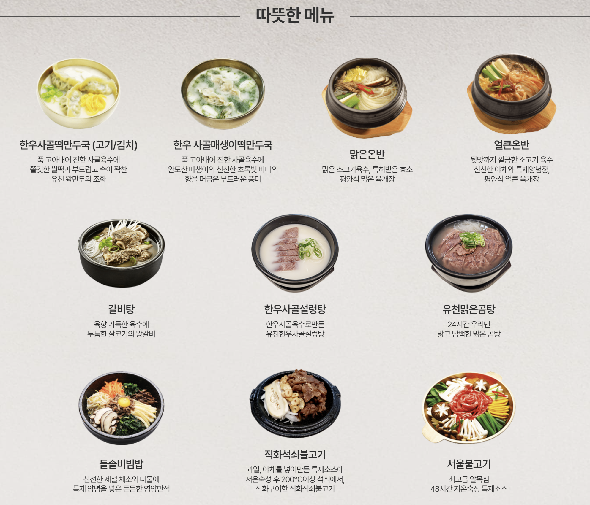 풍납동 유천냉면 본점에서는 다양한 식사류와 단품요리도 판매하고 있습니다. 너무 다양해서 제가 냉면계의 김밥천국이라고 말 했네요. 식사가 필요하신 분은 왕갈비탕이나, 곰탕 등을 추천 드립니다. 그리고 사이드메뉴로 만두나 부추전 많이 주문 하시네요.