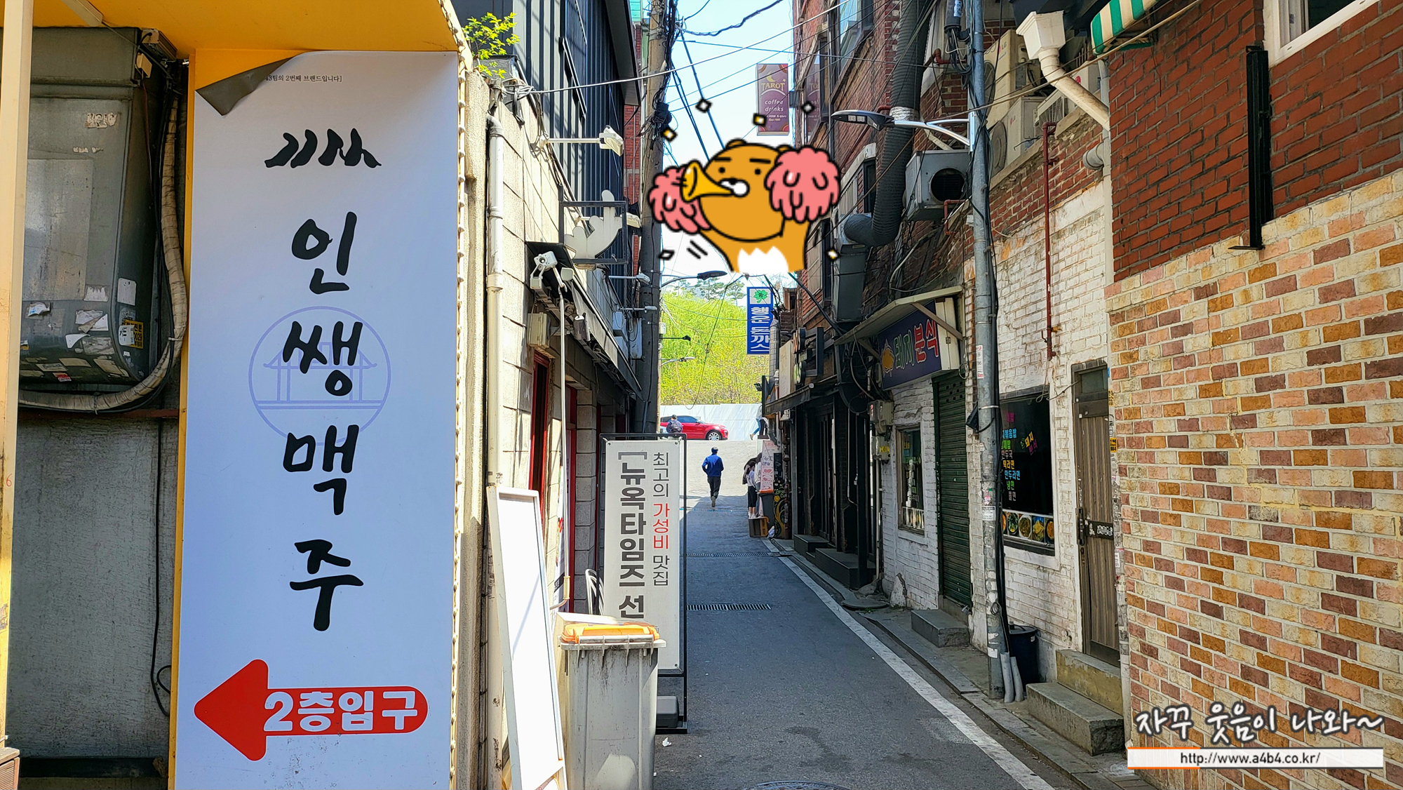 한양대 행운돈까스가 위치한 골목입니다. 차량 진입은 불가능하고요. 윗쪽에 주차할 수 있는 곳은 있으나, 불법주차 단속 안내 현수막이 딱 걸려 있네요.