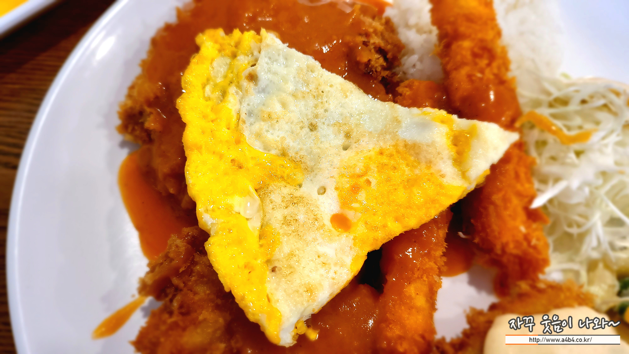 돈가스와 함께 새우튀김, 생선까스가 같이 나오는 세트메뉴 입니다. 여기에 피자조각 모양의 계란 프라이가 얹어 있네요. 요 계란은 상당히 신기하다는...