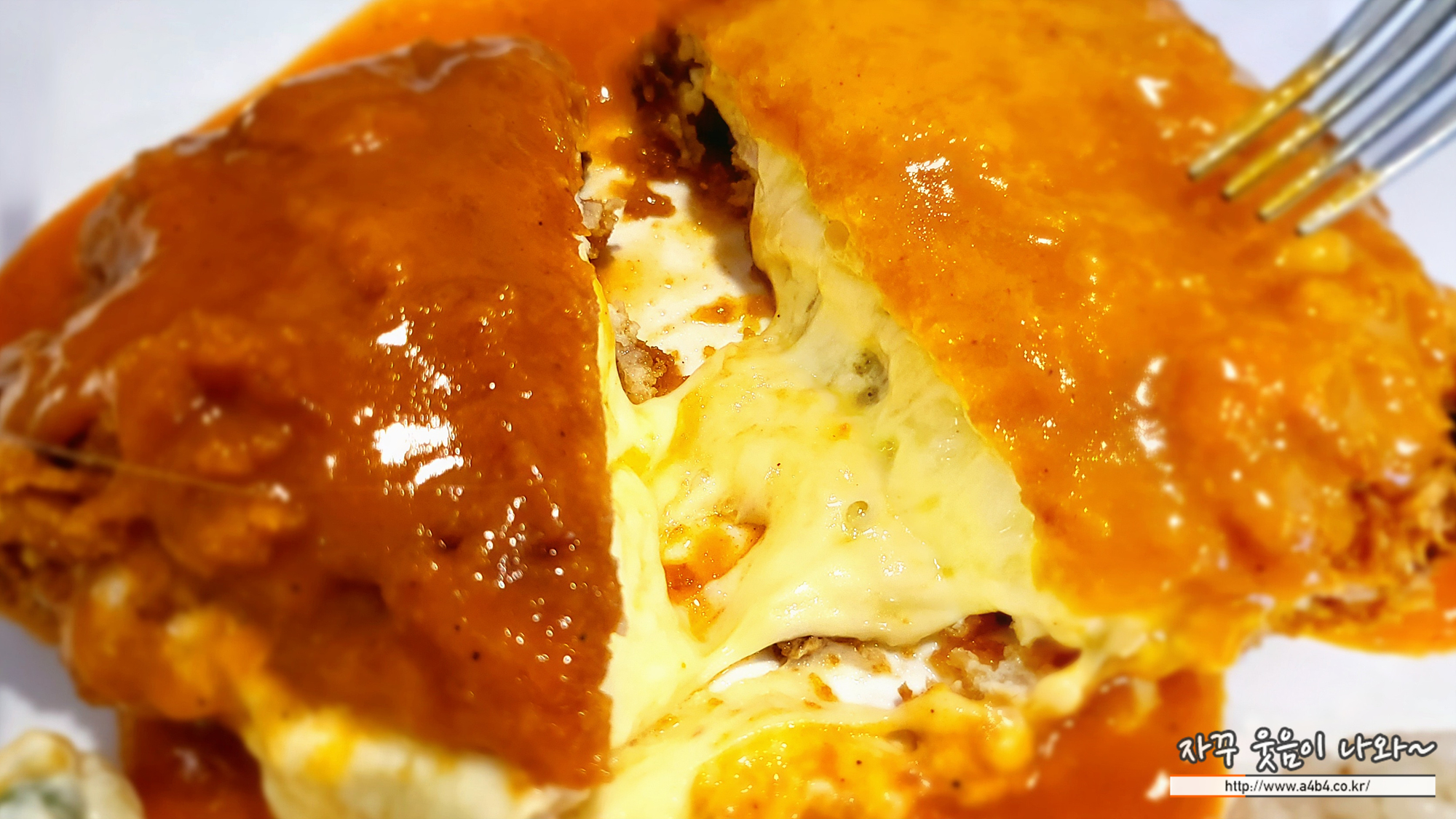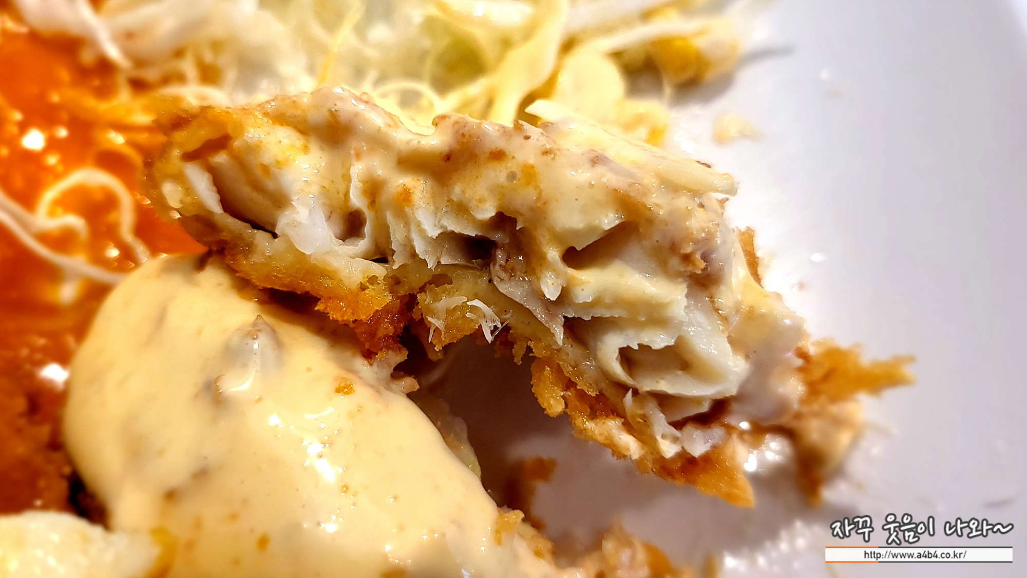 사진과 같이 따뜻한 치즈름 듬쁙 머금은 돈까스가 나왔습니다. 고소한 맛의 치즈 돈까스도 좋은 선택중 하나!