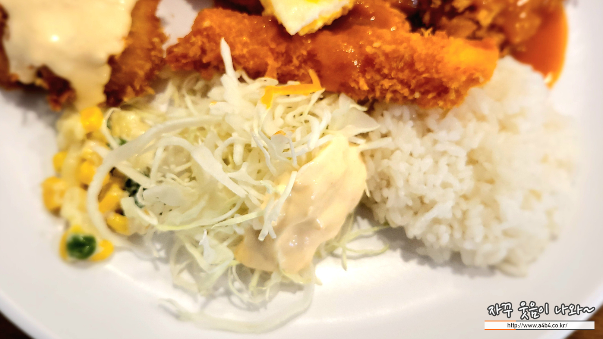 행운돈까스에는 밥 한덩어리와 양배추 샐러드, 마카로니와 옥수수 샐러드가 나옵니다.