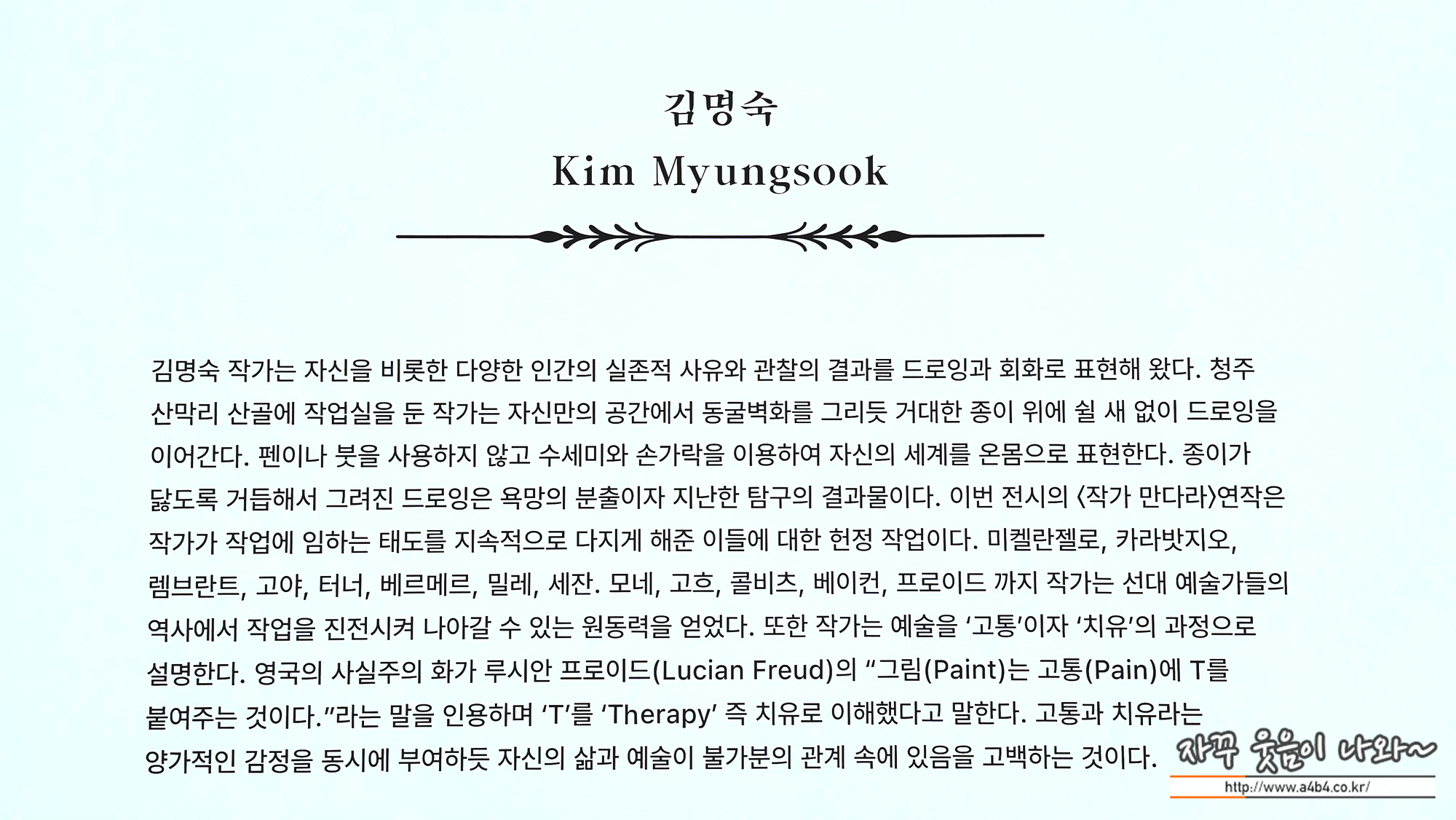 정말로 강렬한 드로잉 작품들을 만나볼 수 있는 공간입니다. 특히 김명숙 작가의 멀티미디어 정보를 보면서 전시된 작품과 1:1 비교하는 것도 상당히 즐거운 경험이었습니다.