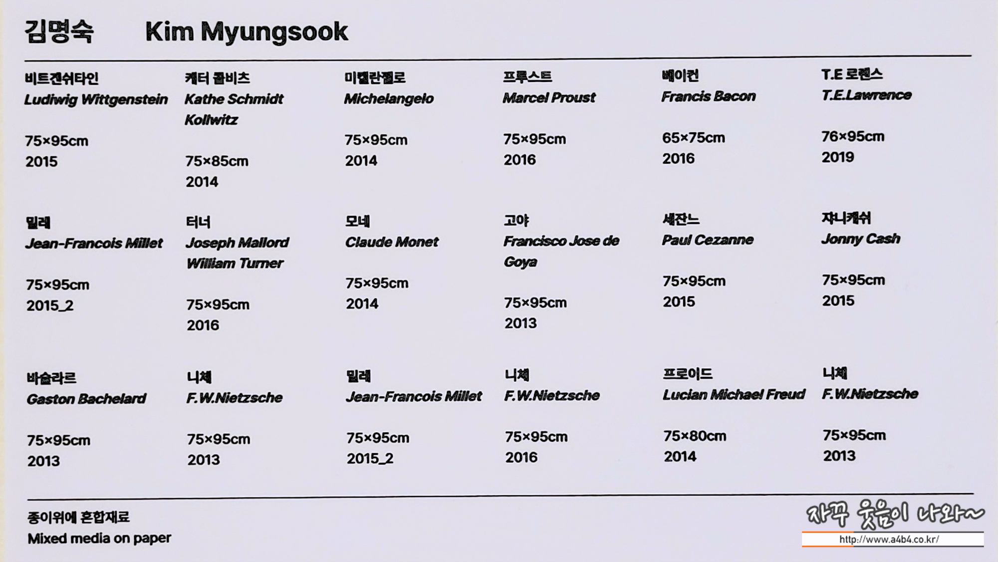 역대 예술가와 철학자들의 초상이 전시되어 있는데, 정말로 한 명 한 명의 샤진과 함께 김명숙 작가의 작품을 보면 더욱 더 작품에 빠져들게 됩니다.