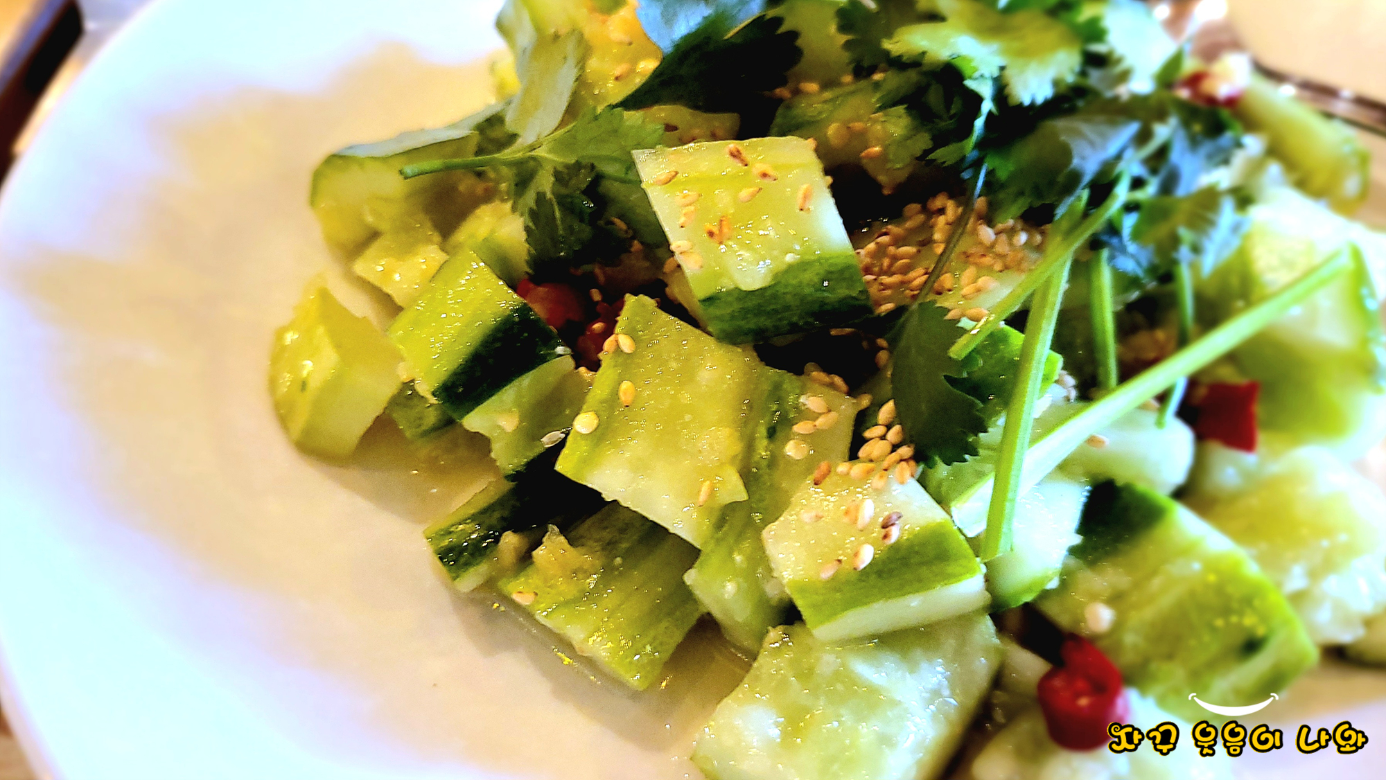제가 잠실 한성양꼬치나 다은 양꼬치 전문점에서 꼭 마무리로 주문하는 메뉴 중 하나가 바로 오이무침입니다. 생오이에 소금과 참기름 깨소금 등을 넣고 버무린 것에 고수가 살짝 올라간 메뉴인데요.