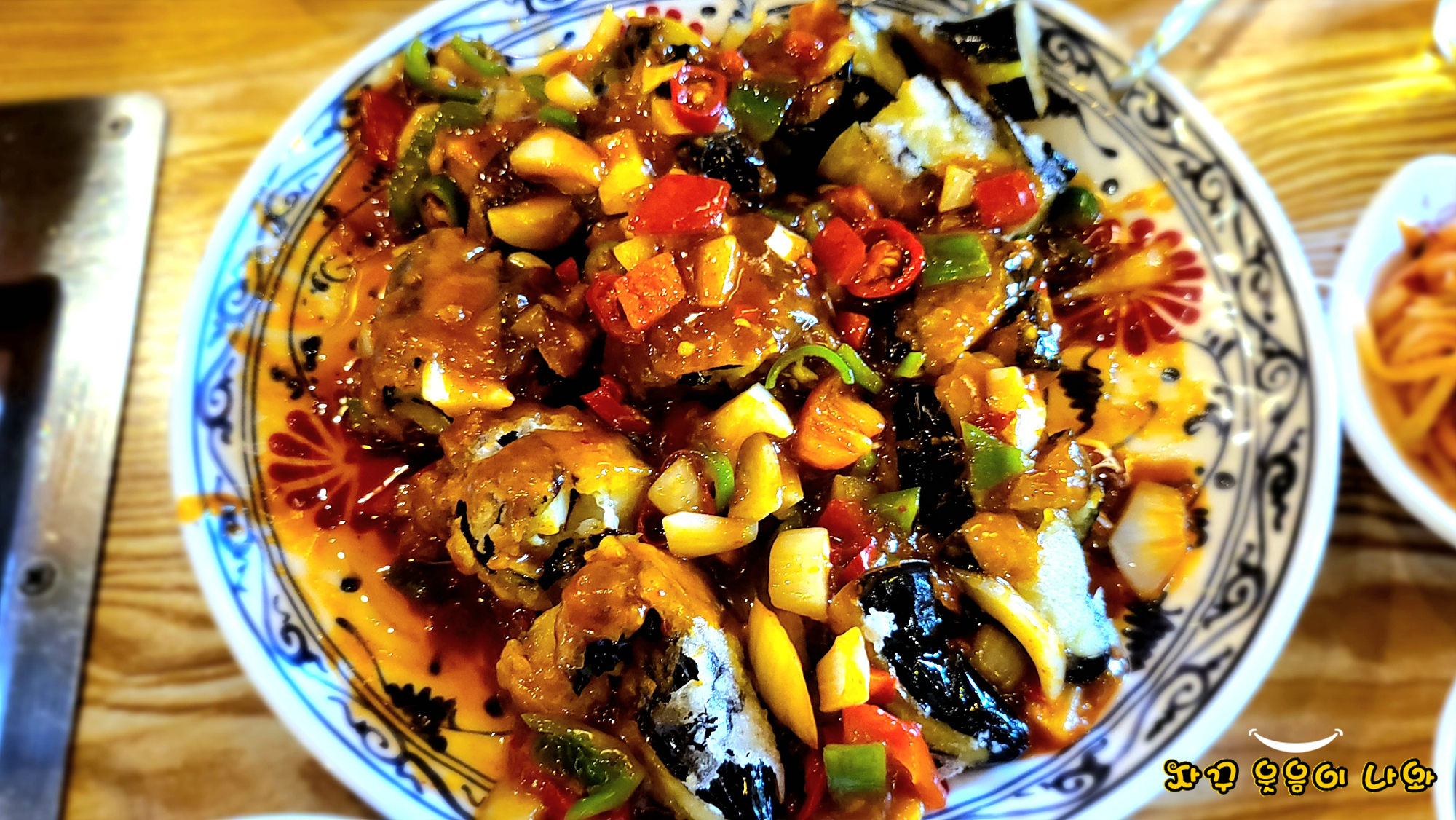살짝 튀긴 가지위에 소스가 얹어진 중국식 가지볶음 입니다. 먼저 가지가 덩어리로 나오고요 바로 앞에서 먹기 편하게 잘라주십니다. 정확하게는 가지볶음과 가지튀김의 중간요리라는 생각입니다.